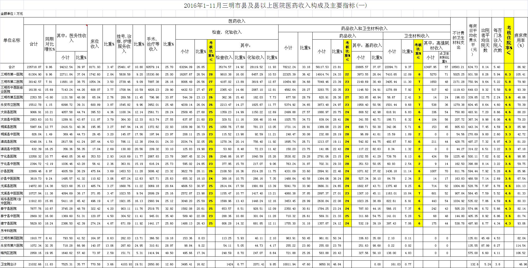 住院率。11月份21家县级以上医院住院率5.30%,比去年同期5.42%,下降0.12个百分点,达标医院有9家,超标12家,其中大田县医院超过4.06个百分点、泰宁县中医院超过3.26个百分点、清流县医院超过2.67个百分点。