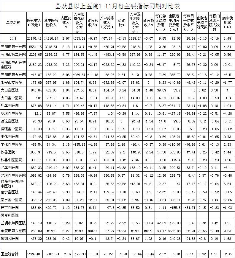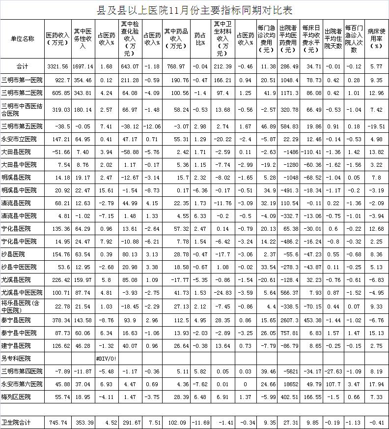 医药总收入。1-11月份21家县级以上医院医药总收入同比增长9.86%,增长超过8%有15家医院,其中建宁县医院同比增长18.24%、清流县中医院同比增长16.25%、泰宁县中医院同比增长16%。