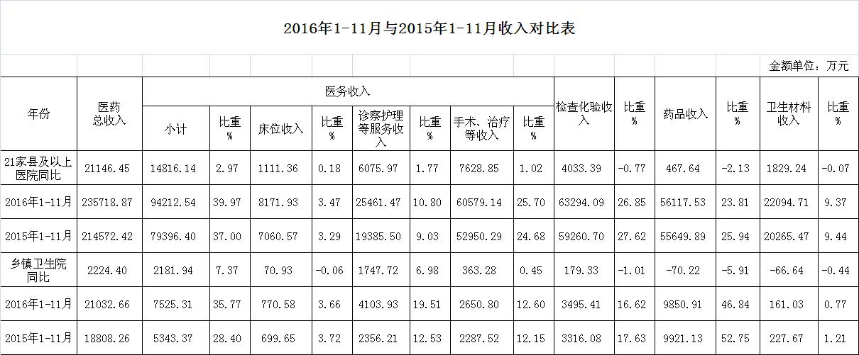 1.医药收入:11月份21家县级以上医院医药总收入23284.53万元,比去年同期19962.97万元,增加3321.56万元,增长16.64%。其中:医务性收入9545.59万元,占医药收入41%(床位收入777.94万元、手术治疗护理等服务收入8767.65万元),比去年同期7848.45万元, 医务性收入增加1697.14万元,增长21.62%;药品收入5451.67万元,比去年同期4682.70万元,增加768.97万元,增长16.42%。