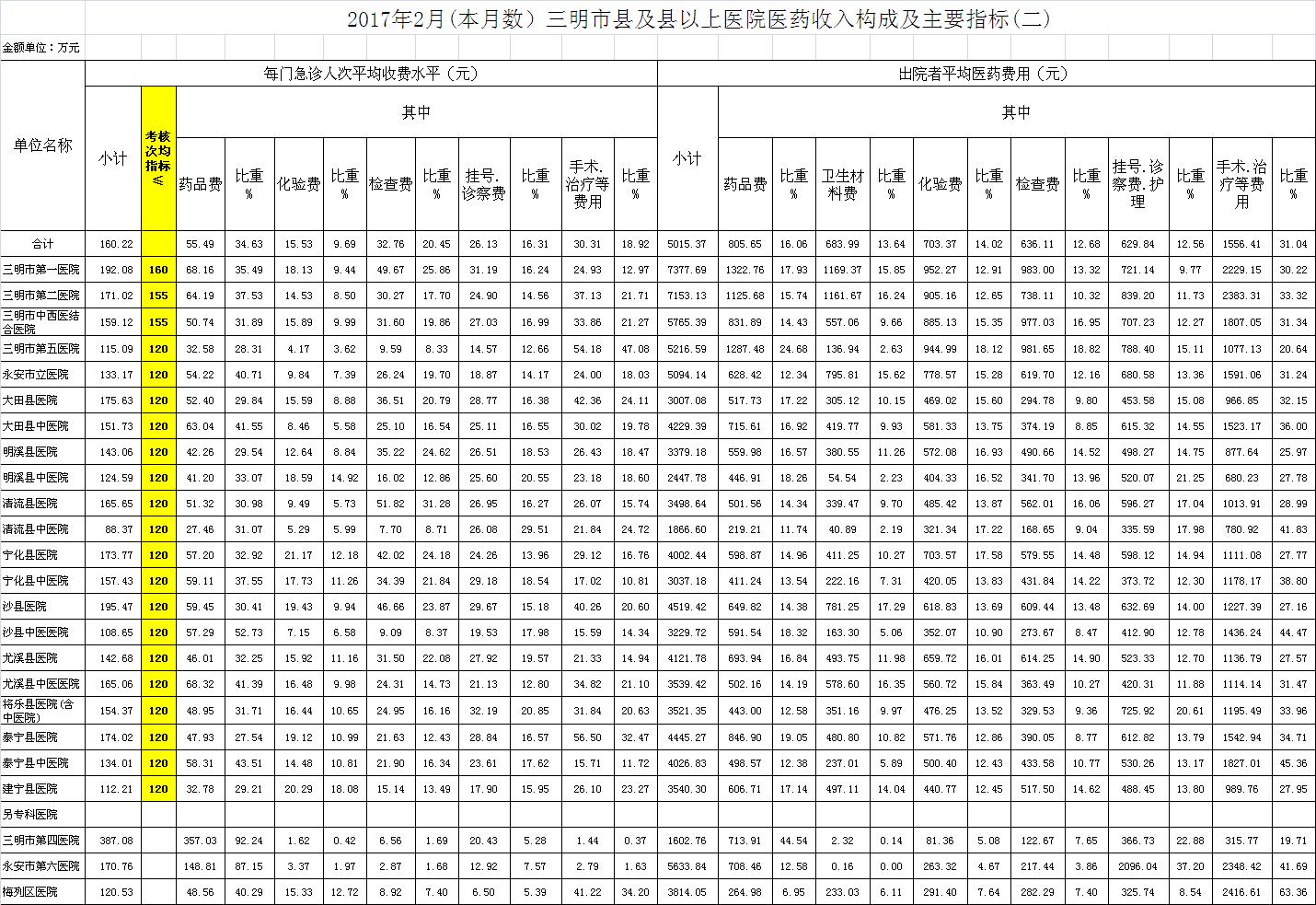 次均费用。2月份21家县级以上医院每门诊次均费用160.22元,比去年同期的153.13元,增加7.09元。达标医院4家,超标17家,其中沙县医院超过75.47元、大田县医院超过55.63元、泰宁县医院超过54.02元;出院者平均费用5015.37元,比去年同期5087.92元,下降72.55元。