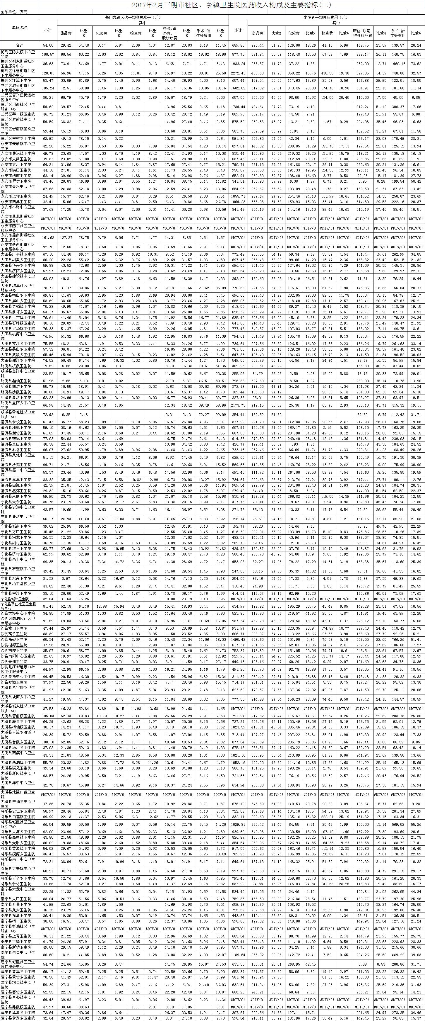 1-2月份基层医疗机构医药总收入3802.69元,去年同期3215.29万元,同比增加587.4万元,增长18.27%,其中:医务性收入1383.01万元,占医药收入36.37%(床位收入111.85万元、手术治疗护理等服务收入1271.16万元),去年同期1095.49万元, 医务性收入同比增加287.52万元,增长26.25%;检查化验收入539.65万元,同比增长19.61%;药品收入1856.09万元,去年同期1640.78万元,同比增长215.31万元,增长13.12%,药占比48.81%,去年同期51.03%,同比下降2.22个百分点;卫生材料收入23.94万元,去年同期27.86万元,同比减少3.92万元,占医药收入0.63%,去年同期0.87%,同比下降0.24个百分点。入院人次13769人次,去年同期13823人次,同比减少54人次,下降0.39%,其中明溪县、泰宁县、三元区分别下降47.5%、37.5%、8.38%;门急诊人次529952人次,去年同期370403人次,同比增加159549人次,增长43.07%;每门诊次均费用54.02元,去年同期61.27元,同比减少7.25元,下降11.83%;出院者平均费用676.52元,去年同期686.73元,同比减少10.21元,下降1.49%。