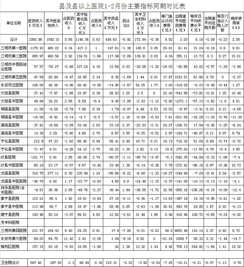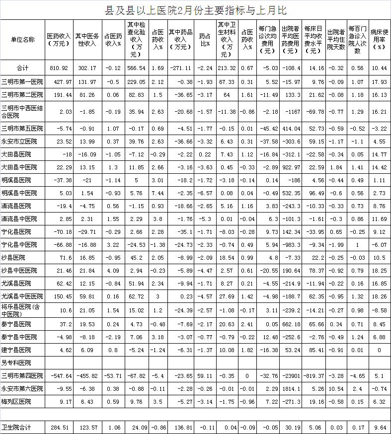 医药总收入。1-2月份21家县级以上医院医药总收入同比增长8.86%,增长超过8%有12家医院,其中泰宁县中医院同比增长28.35%、建宁县医院同比增长22.13%、市第二医院同比增长20.8%。