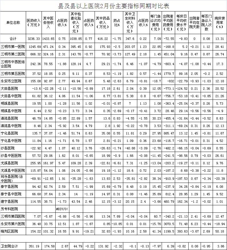 卫生材料占比。2月份21家县级以上医疗卫生材料收入占医药总收入的9.51%,比去年同期9.29%,下降0.22个百分点,达标医院4家,超过核定指标有17家医院,其中市第二医院超过5.58个百分点、市第一医院超过4.15个百分点、沙县医院超过3.85个百分点。
