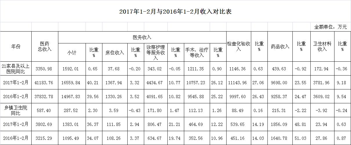 (一)1- 2月份21家县级以上医院:医药总收入41183.76万元,比去年同期37832.79万元,增加3350.97万元,增长8.86%。其中:医务性收入16559.84万元,占医药收入40.21%(床位收入1367.94万元、手术治疗护理等服务收入15191.9万元),比去年同期14967.83万元,医务性收入增加1592.01万元,增长10.64%;检查化验收入11143.96万元,同比增长11.47%;药品收入9698万元,药占比23.55%,分别比去年同期增长4.75%、下降0.92个百分点;卫生材料收入3781.96万元(其中高值耗材收入1964.05万元),占医药总收入9.18%,比去年同期9.54%,下降0.36个百分点。入院人次49674人次,比去年同期47504人次,增加2170人次,增长4.57%;门急诊人次897004人次,比去年同期823047人次,增加73957人次,增长8.99%;每门诊次均费用162.72元,比去年同期153.2元,增加9.52元,增长6.21%;出院者平均费用5078.81元,比去年同期5076.78元,增加2.03元,增长0.04%。