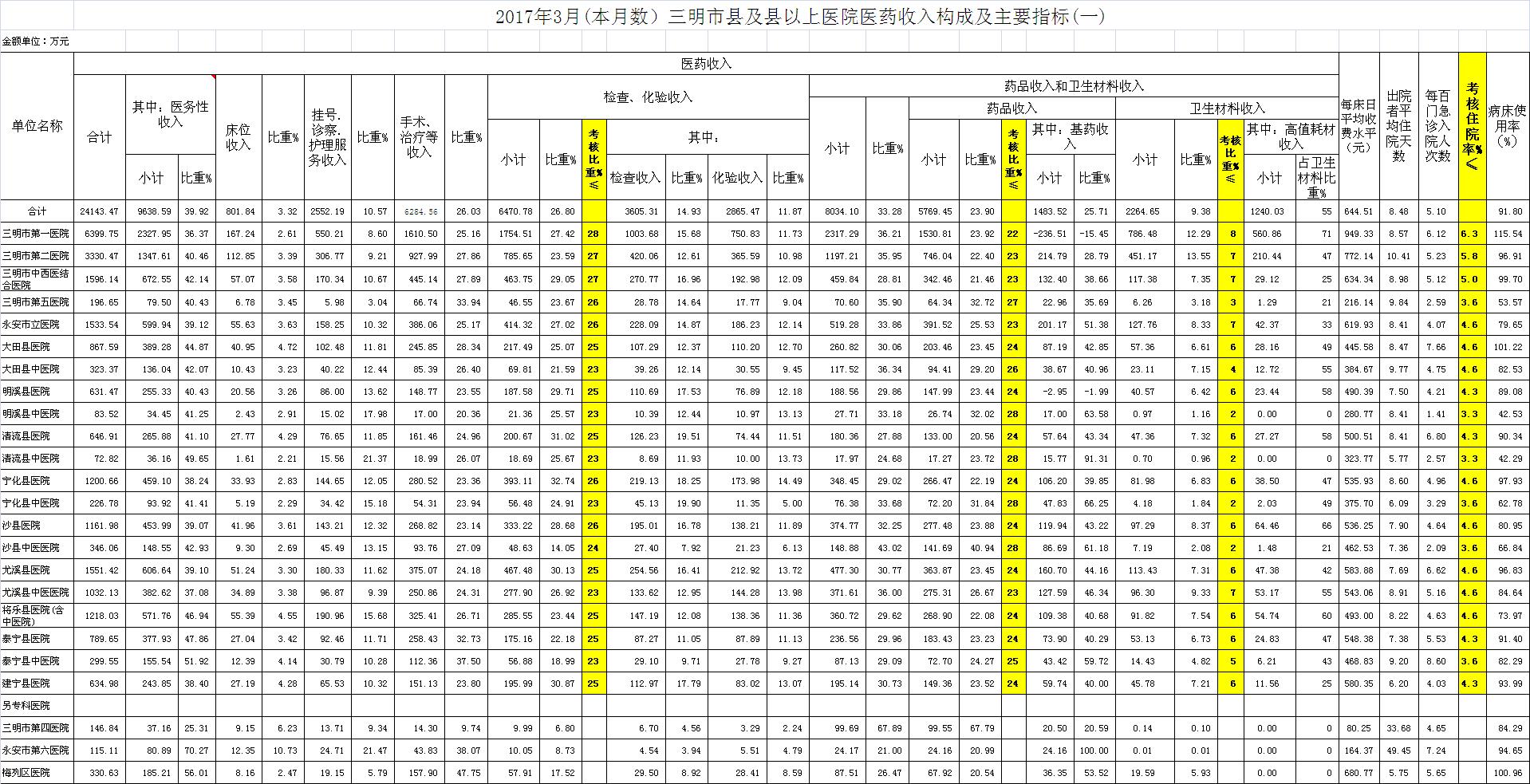 卫生材料占比。3月份21家县级以上医院卫生材料收入占医药总收入的9.38%,比去年同期9.62%,下降0.24个百分点,达标医院3家,超过核定指标有18家医院,其中市第二医院超过5.49个百分点、市第一医院超过4.11个百分点、沙县医院超过3.04个百分点。