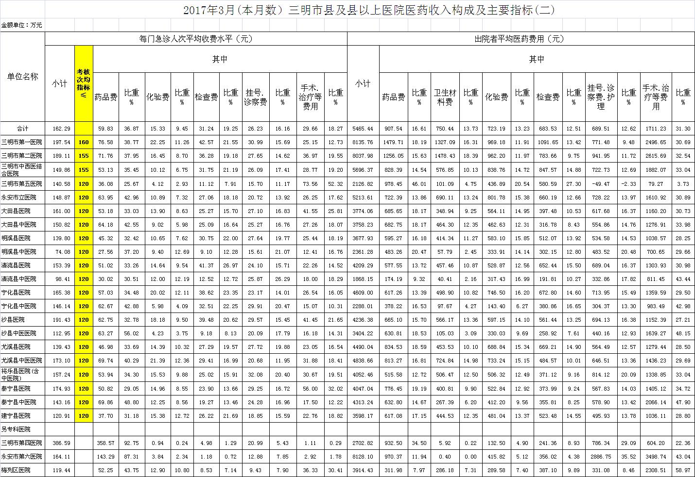 次均费用。3月份21家县级以上医院每门诊次均费用162.29元,比去年同期的149.32元,增加12.97元。达标医院3家,超标18家,其中沙县医院超过72.51元、大田县医院超过55.33元、泰宁县医院超过54.32元;出院者平均费用5465.44元,比去年同期5247.22元,增加218.22元。