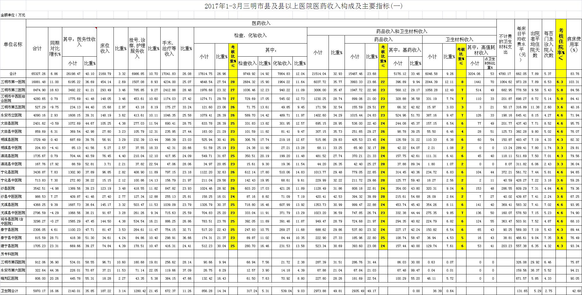 住院率。3月份21家县级以上医院住院率5.1%,比去年同期5.37%,下降0.27个百分点,达标医院有7家,超标14家,其中大田县医院超过3.92个百分点、泰宁县中医院超过3.75个百分点、清流县医院超过2.71个百分点。
