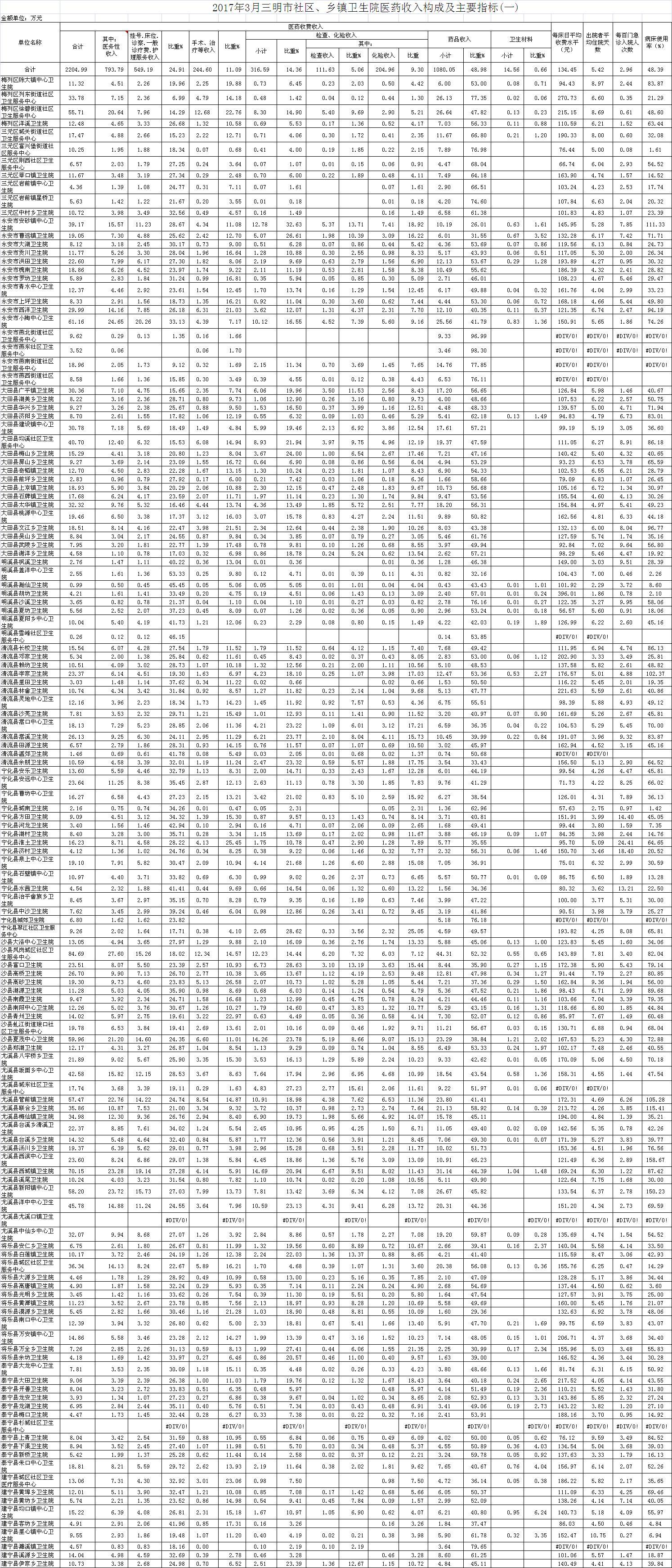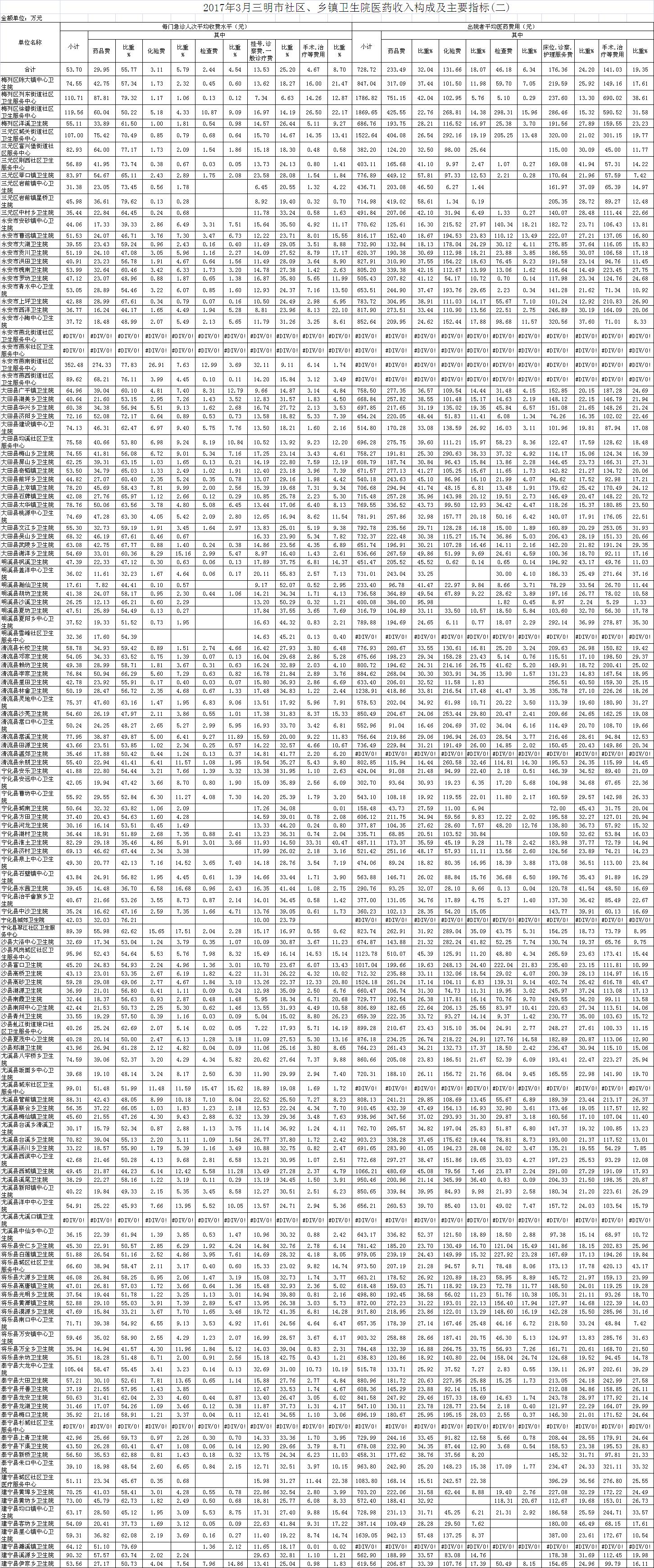 1-3月份基层医疗机构医药总收入5970.17元,去年同期5144.04万元,同比增加826.13万元,增长16.06%,其中:医务性收入2140.01万元,占医药收入35.85%(床位收入187.22万元、手术治疗护理等服务收入1952.79万元),去年同期1776.71万元, 医务性收入同比增加363.3万元,增长20.45%;检查化验收入856.28万元,同比增长13.25%;药品收入2935.49万元,去年同期2565.88万元,同比增长369.61万元,增长14.4%,药占比49.17%,去年同期49.88%,同比下降0.71个百分点;卫生材料收入38.39万元,去年同期45.33万元,同比减少6.94万元,占医药收入0.64%,去年同期0.88%,同比下降0.24个百分点。入院人次22476人次,去年同期23109人次,同比减少633人次,下降2.74%,其中泰宁县、三元区、永安市分别下降40.15%、33.84%、11.17%;门急诊人次816935人次,去年同期582630人次,同比增加234305人次,增长40.22%;每门诊次均费用53.86元,去年同期60.8元,同比减少6.94元,下降11.41%;出院者平均费用696.43元,去年同期695.19元,同比减少1.24元,下降0.18%。
