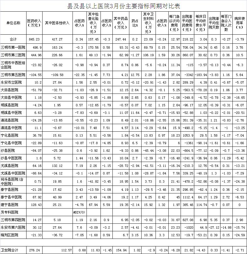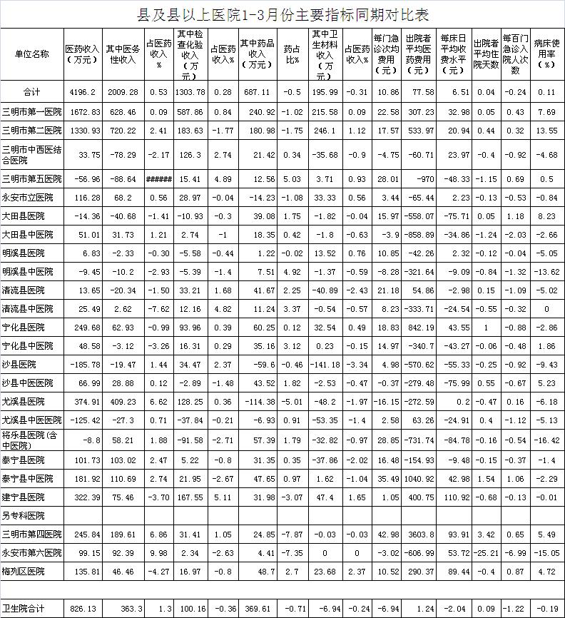 医药总收入。1-3月份21家县级以上医院医药总收入同比增长6.86%,增长超过8%有6家医院,其中泰宁县中医院同比增长28.71%、建宁县医院同比增长23.31%、市第二医院同比增长18.63%。