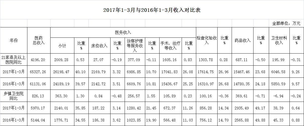 (一)1-3月份21家县级以上医院:医药总收入65327.26 万元,比去年同期61131.05万元,增加4196.2万元,增长6.86%。其中:医务性收入26198.47万元,占医药收入40.1%(床位收入2169.79万元、手术治疗护理等服务收入24028.68万元),比去年同期24189.19万元,医务性收入增加2009.28万元,增长8.31%;检查化验收入17614.75万元,同比增长7.99%;药品收入15467.46万元,药占比23.68%,分别比去年同期增长4.65%、下降0.5个百分点;卫生材料收入6046.58万元(其中高值耗材收入3204.06万元),占医药总收入9.26%,比去年同期9.57%,下降0.31个百分点。入院人次76975人次,比去年同期75514人次,增加1461人次,增长1.93%;门急诊人次1432346人次,比去年同期1344925人次,增加87421人次,增长6.5%;每门诊次均费用162.56元,比去年同期151.7元,增加10.86元,增长7.16%;出院者平均费用5223.57元,比去年同期5145.99元,增加77.58元,增长1.51%。