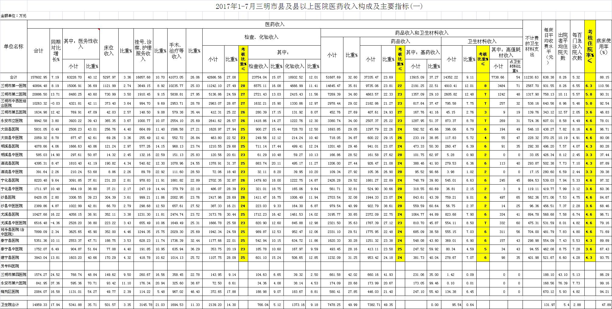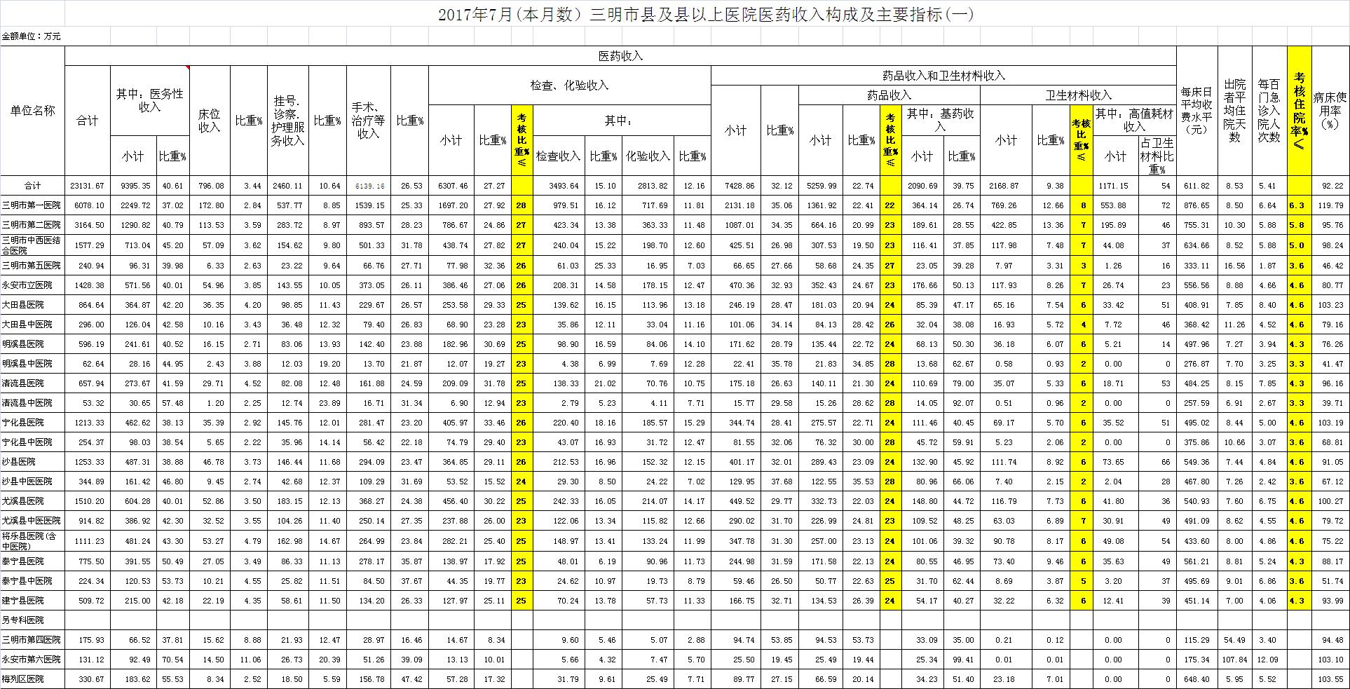 住院率。7月份21家县级以上医院住院率5.41%,比去年同期5.44%,下降0.03个百分点,达标医院有9家,超标12家,其中泰宁县中医院超过3.68个百分点、大田县医院超过3.56个百分点、清流县医院超过2.8个百分点。