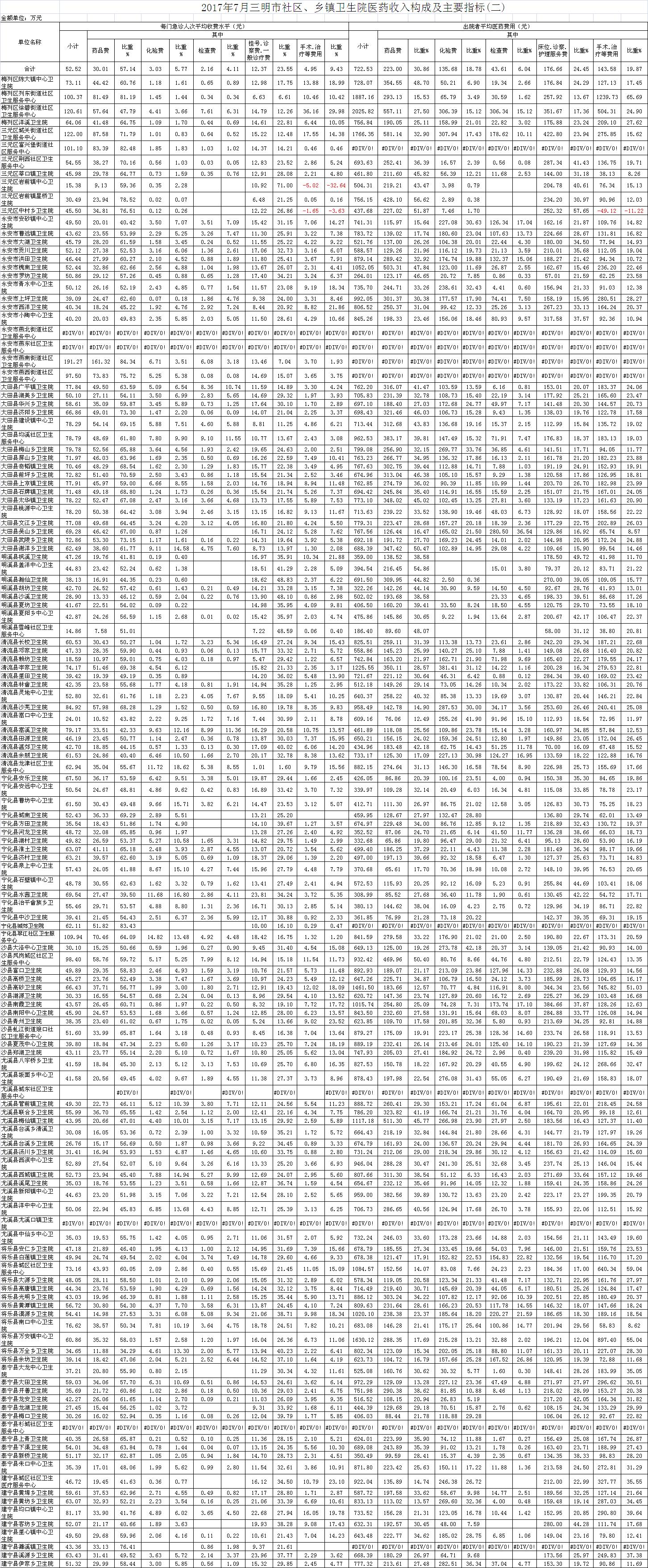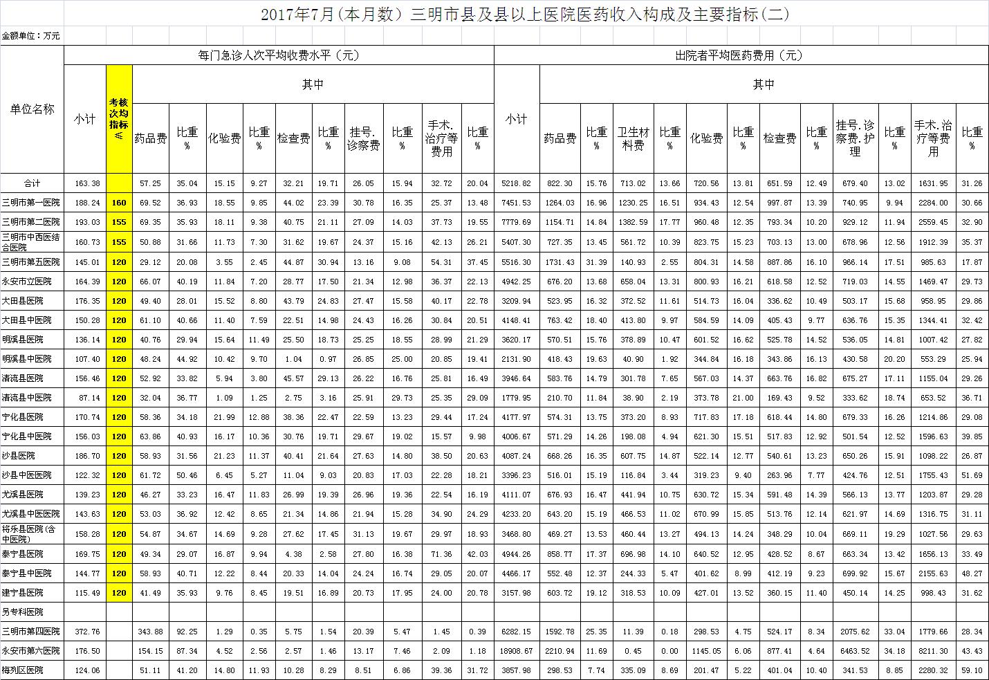 次均费用。7月份21家县级以上医院每门诊次均费用163.38元,比去年同期的158.54元,增加4.84元。达标医院3家,超标18家,其中沙县医院超过68.3元、大田县医院超过58.5元、泰宁县医院超过50.59元;出院者平均费用5218.82元,比去年同期4929.65元,增加289.17元。