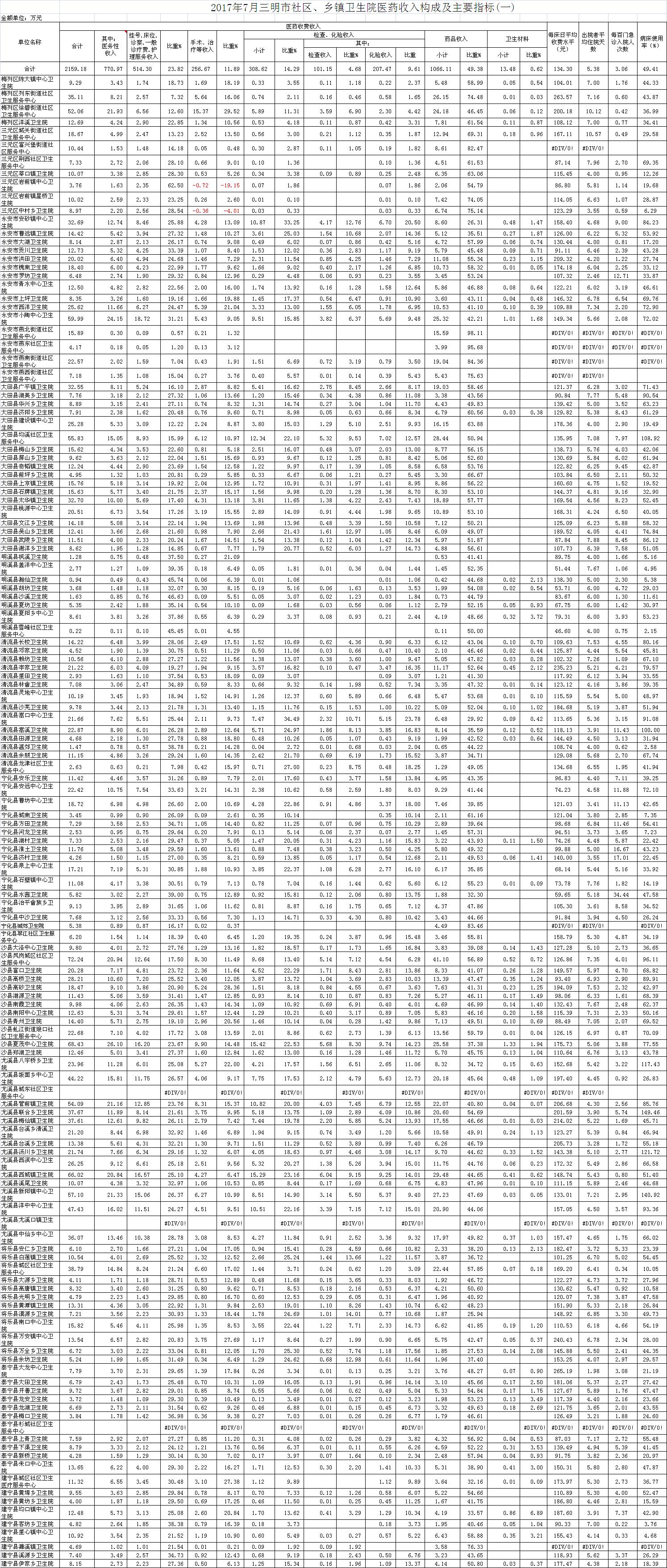 1-7月份基层医疗机构医药总收入14959.33万元,去年同期12683.9万元,同比增加2275.43万元,增长17.94%,其中:医务性收入5341.88万元,占医药收入35.71%(床位收入501.57万元、手术治疗护理等服务收入4840.31万元),去年同期4514.95万元, 医务性收入同比增加825.93万元,增长18.32%;检查化验收入2139.2万元,同比增长10.87%;药品收入7382.71万元,去年同期6132.82万元,同比增长1249.89万元,增长20.38%,药占比49.35%,去年同期48.35%,同比增长1个百分点;卫生材料收入95.54万元,去年同期106.71万元,同比减少11.17万元,占医药收入0.64%,去年同期0.84%,同比下降0.2个百分点。入院人次58486人次,去年同期59576人次,同比减少1090人次,下降1.83%,其中泰宁县、三元区、明溪县分别下降34.01%、23.2%、19.38%、;门急诊人次2032583人次,去年同期1442089人次,同比增加590494人次,增长40.95%;每门诊次均费用53.12元,去年同期59.11元,同比减少5.99元,下降10.13%;出院者平均费用712.64元,去年同期697.9元,同比增加14.74元,增长2.11%。