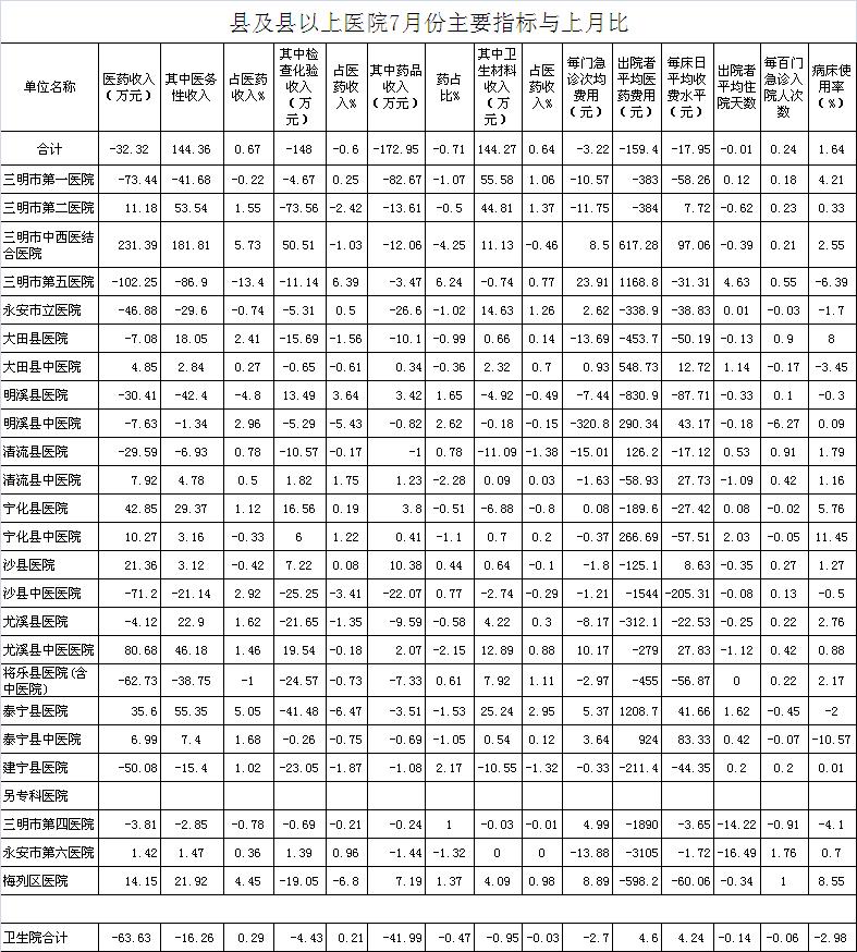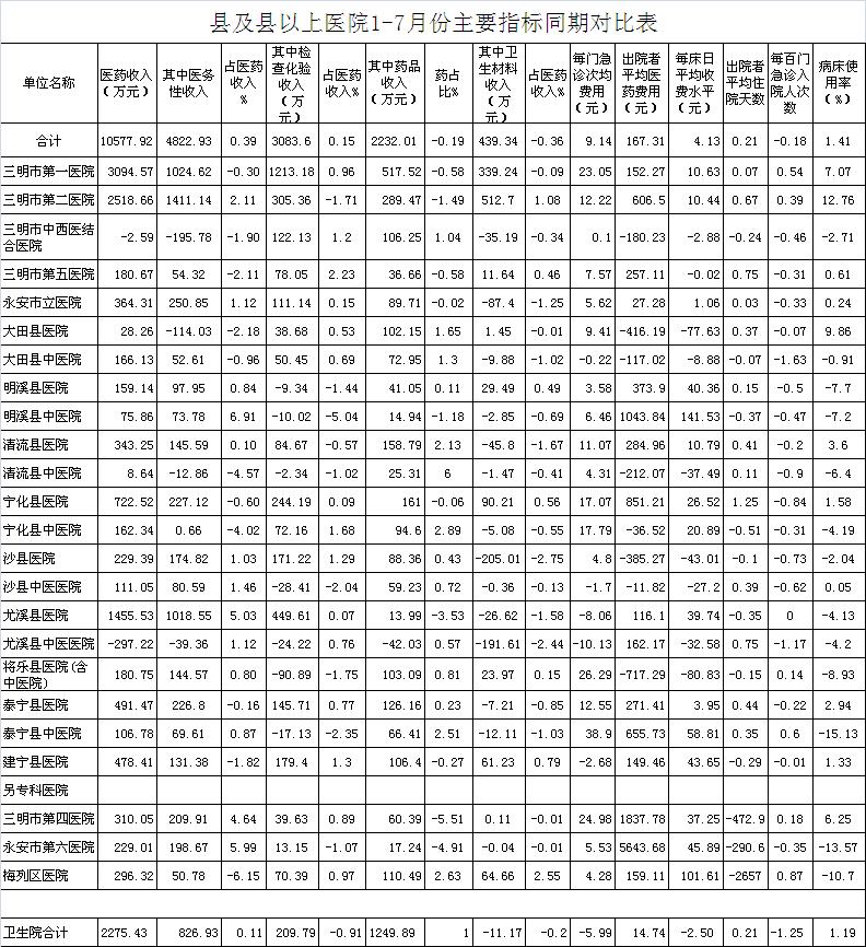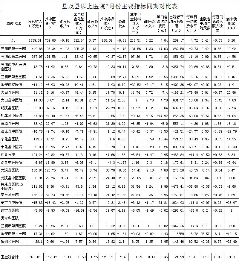 医药总收入。1-7月份21家县级以上医院医药总收入同比增长7.19%,增长超过8%有11家医院,其中尤溪县医院同比增长16.22%、明溪县医院同比增长14.9%、建宁县医院同比增长13.81%。