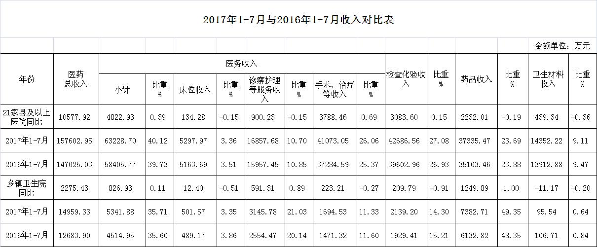 (一)1-7月份21家县级以上医院:医药总收入157602.95万元,比去年同期147025.04万元,增加10577.91万元,增长7.19%。其中:医务性收入63228.7万元,占医药收入40.12%(床位收入5297.97万元、手术治疗护理等服务收入57930.73万元),比去年同期58405.77万元,医务性收入增加4822.93万元,增长8.26%;检查化验收入42686.56万元,同比增长7.79%;药品收入37335.47万元,药占比23.69%,分别比去年同期增长6.36%、下降0.19个百分点;卫生材料收入14352.22万元(其中高值耗材收入7738.66万元),占医药总收入9.11%,比去年同期9.47%,下降0.36个百分点。入院人次185540人次,比去年同期181845人次,增加3695人次,增长2.03%;门急诊人次3484403人次,比去年同期3301339人次,增加183064人次,增长5.55%;每门诊次均费用163.74元,比去年同期154.6元,增加9.14元,增长5.91%;出院者平均费用5273.02元,比去年同期5105.71元,增加167.31元,增长3.28%。
