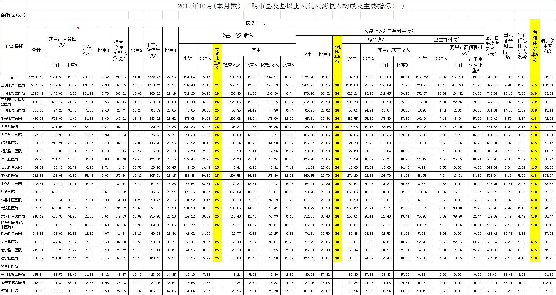 住院率。10月份21家县级以上医院住院率5.42%,比去年同期5.54%,下降0.12个百分点,达标医院有12家,超标9家,其中大田县医院超过3.95个百分点、泰宁县中医院超过3.75个百分点、清流县医院超过2.59个百分点。