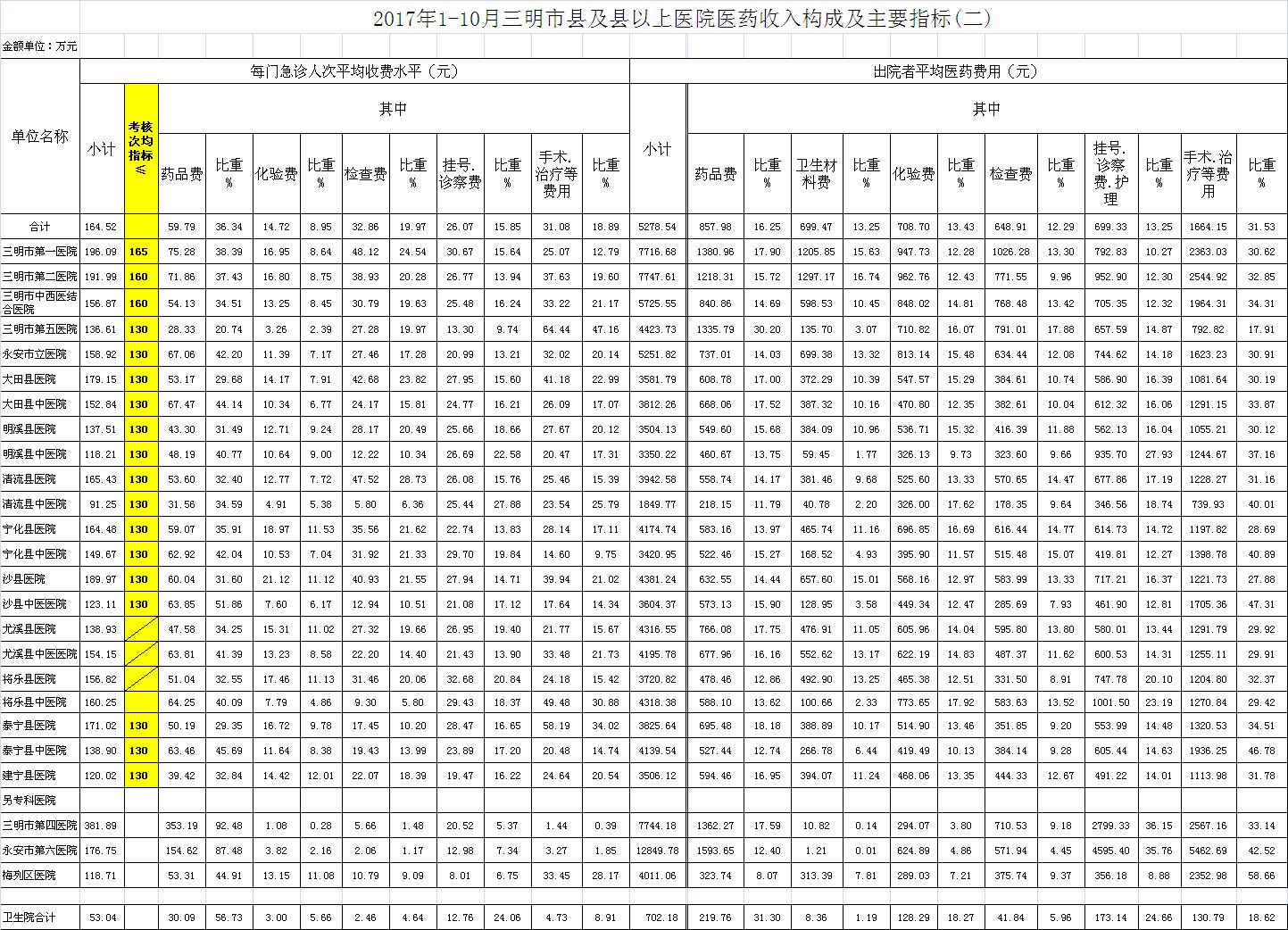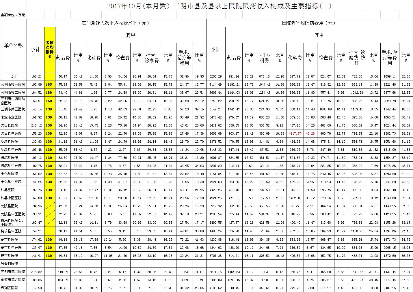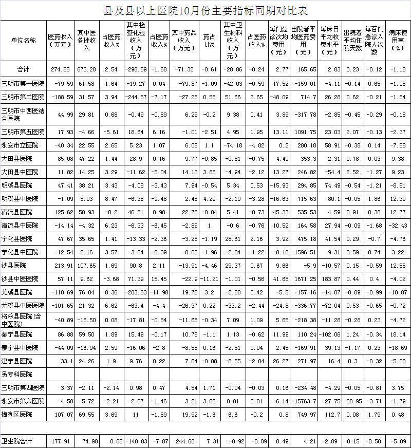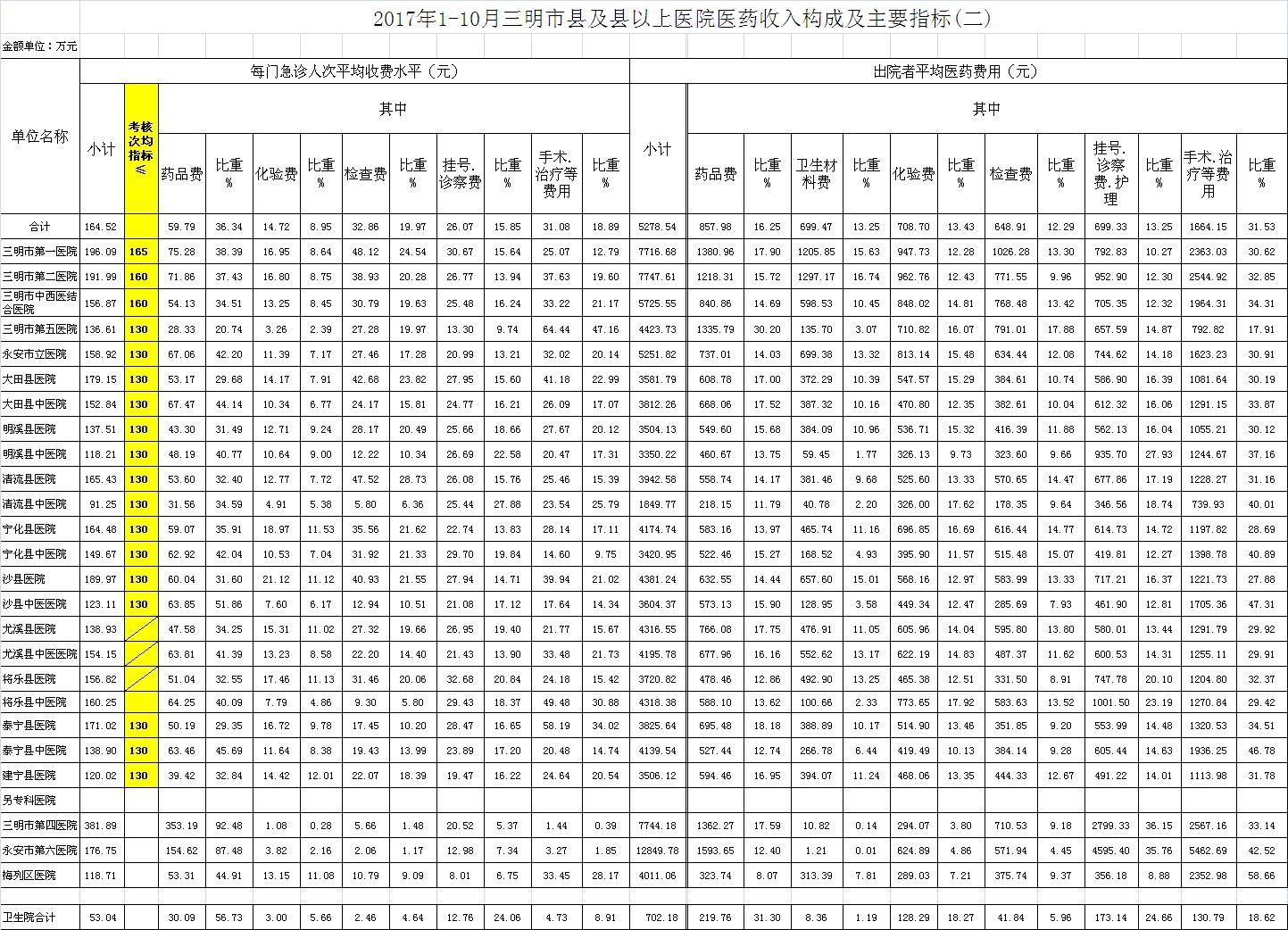 次均费用。10月份21家县级以上医院每门诊次均费用165.21元,比去年同期的162.44元,增加2.77元。达标医院3家,超标15家(将乐县总医院、尤溪县医院与尤溪县中医院不参与次均费用考核),其中大田县医院超过85.12元、沙县医院超过67.76元、清流县医院超过67.12元;出院者平均费用5200.29元,比去年同期5034.64元,增加165.65元。