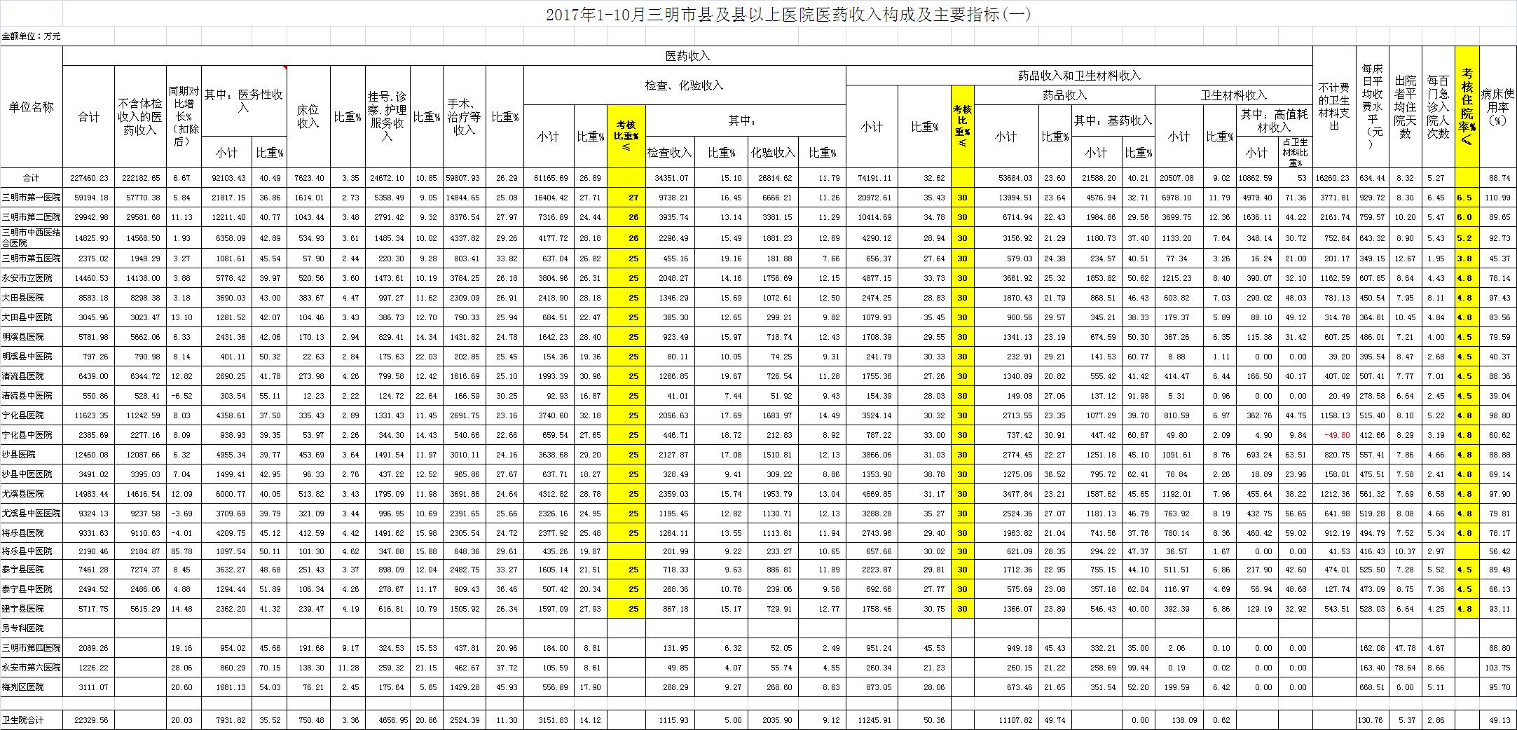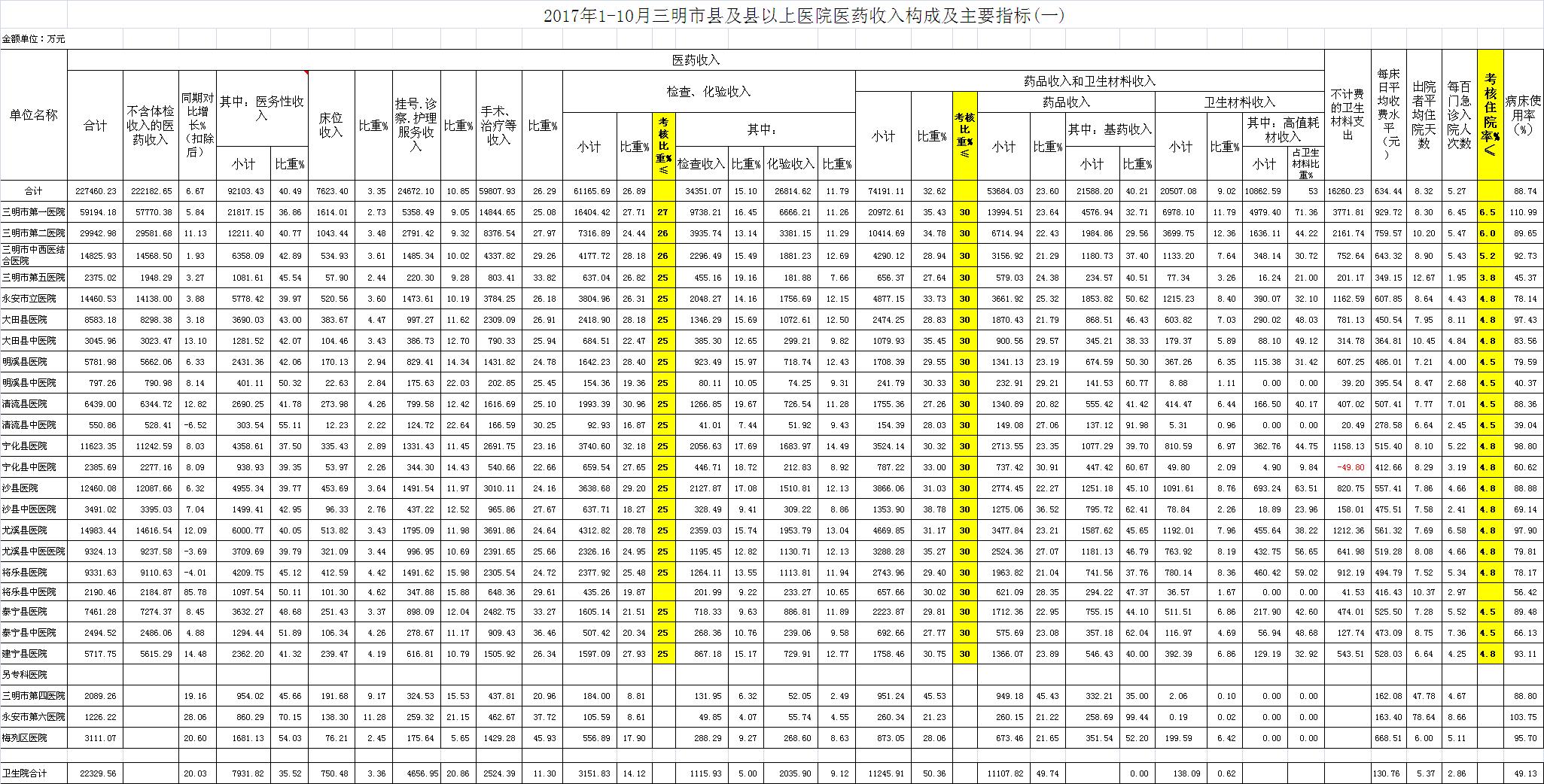 (一)1-10月份21家县级以上医院:医药总收入227460.23万元,不含体检收入的医药收入为222182.65万元,比去年同期208287.18万元增加13895.47万元,增长6.67%。其中:医务性收入92103.43万元,占医药收入40.49%(床位收入7623.4万元、手术治疗护理等服务收入84480.03万元),比去年同期84666.98万元,医务性收入增加7436.45万元,增长8.78%;检查化验收入61165.69万元,同比增长7.05%;药品收入53684.03万元,药占比23.6%,分别比去年同期增长5.96%、下降0.25个百分点;卫生材料收入20507.08万元(其中高值耗材收入10862.59万元),占医药总收入9.02%,比去年同期9.4%,下降0.38个百分点。入院人次266407人次,比去年同期260240人次,增加6167人次,增长2.37%;门急诊人次5056451人次,比去年同期4807548人次,增加248903人次,增长5.18%;每门诊次均费用164.52元,比去年同期156.21元,增加8.31元,增长5.32%;出院者平均费用5278.54元,比去年同期5138.09元,增加140.45元,增长2.73%。