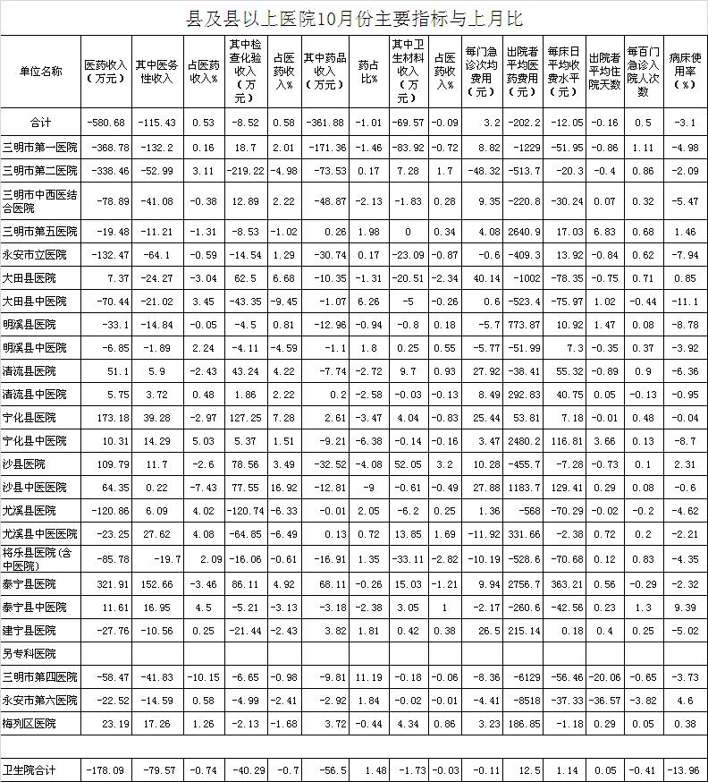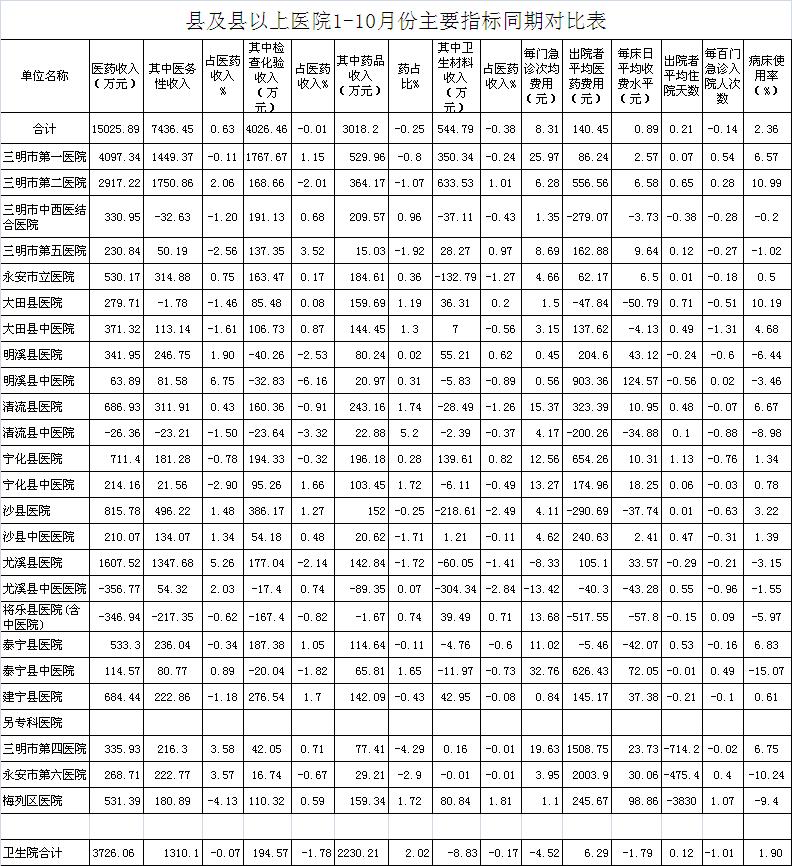 医药总收入。1-10月份21家县级以上医院医药总收入同比增长7.07%,不含体检收入的医药收入同比增长6.67%,增长超过8%有9家医院,其中建宁县医院同比增长14.48%、大田县中医院13.1%、清流县医院同比增长12.82%。