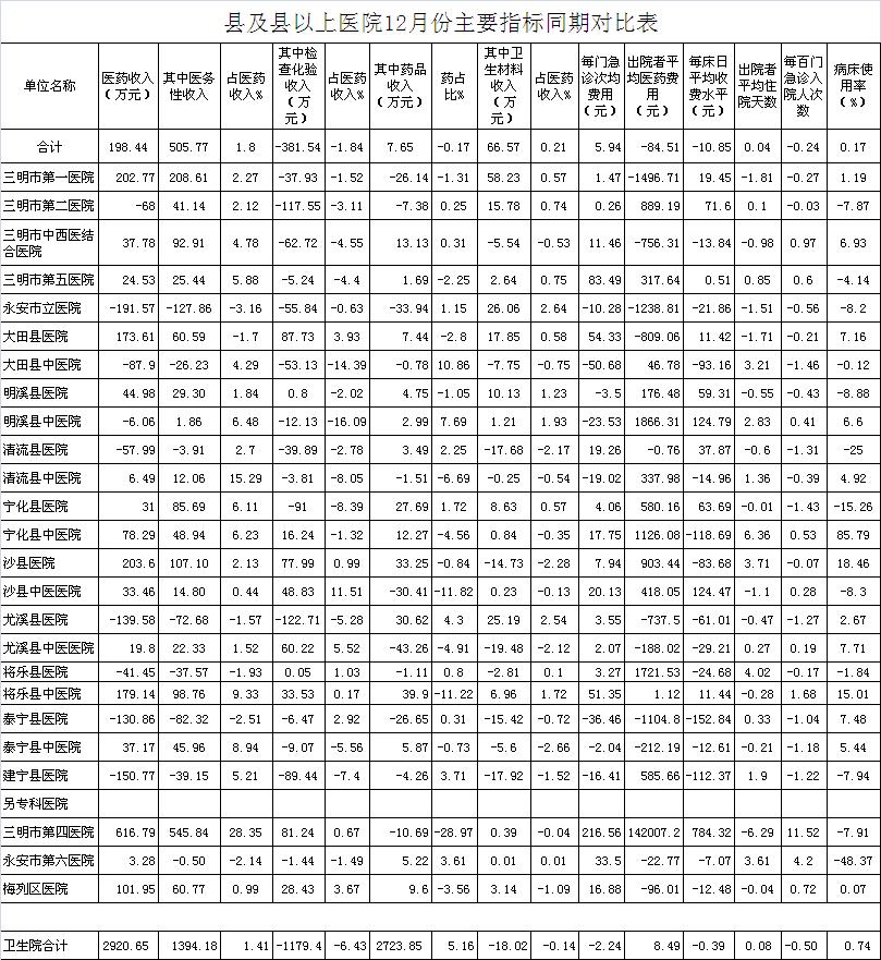医药总收入。1-12月份22家县级以上医院医药总收入同比增长5.82%(不含体检收入的医药收入同比增长5.72%),增长超过8%有5家医院,其中宁化县中医院11.75%、三明市第五医院同比增长10.74%、大田县中医院同比增长9.86%。