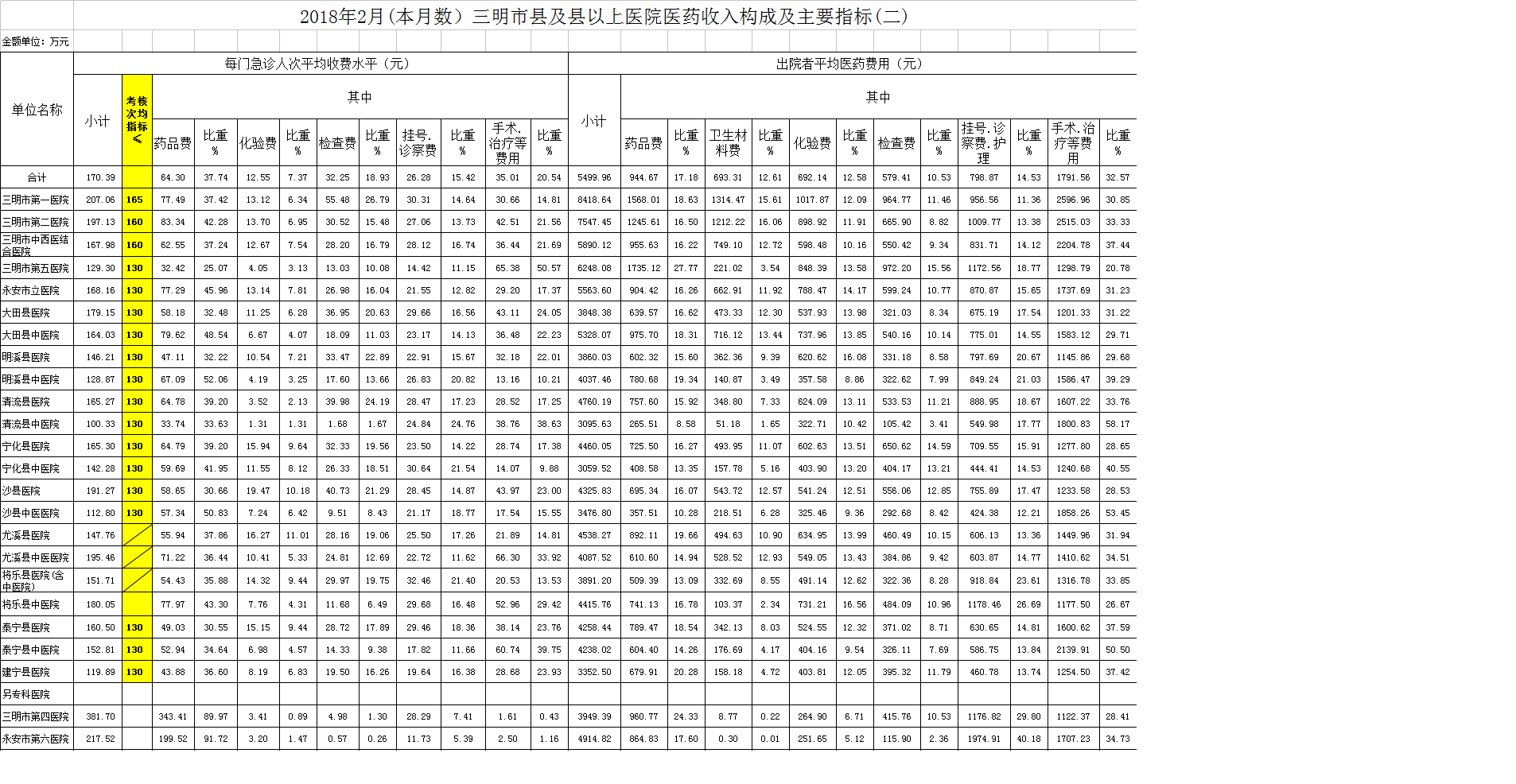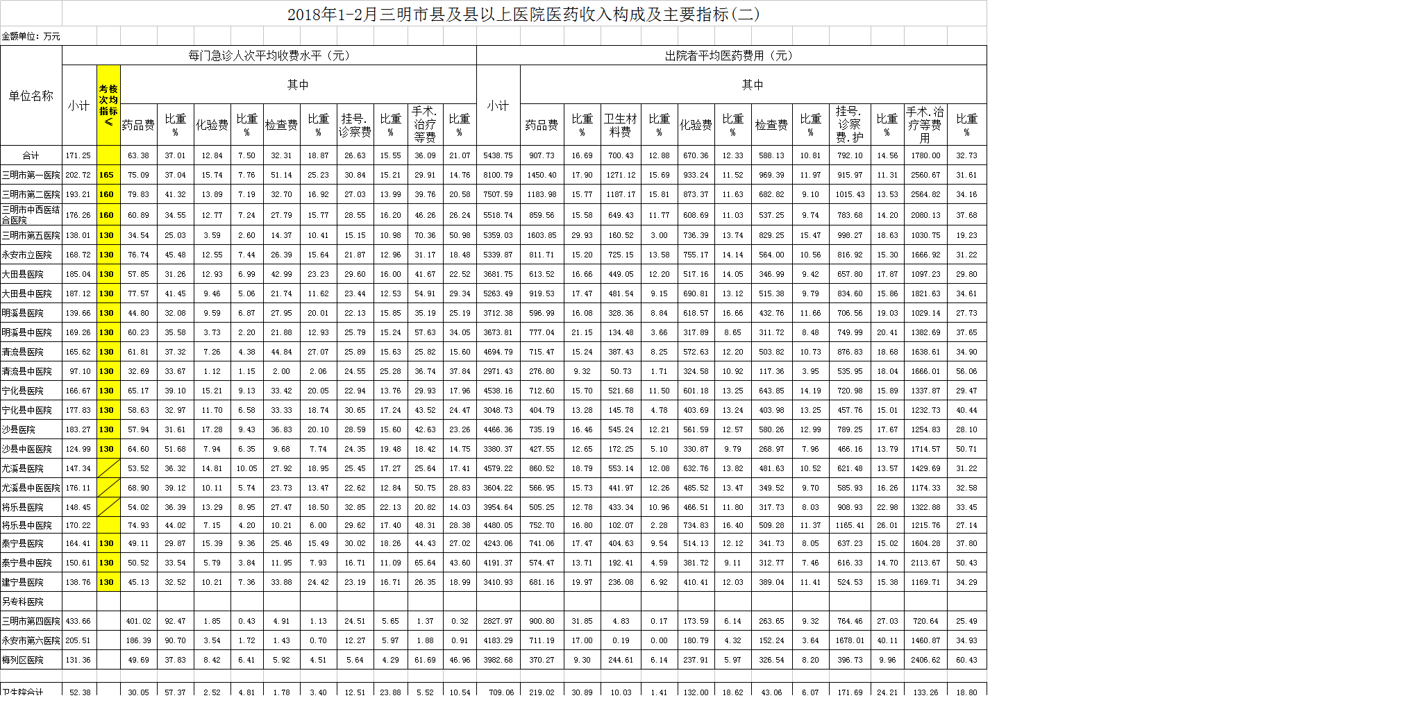 次均费用。2月份22家县级以上医院每门诊次均费用170.39元,比去年同期的160.22元,增加10.17元。达标医院5家,超标13家(将乐县医院、中医院和尤溪县医院、中医院不参与次均费用考核),其中沙县医院超过61.27元、大田县医院超过49.15元、三明市第一医院超过42.06元;出院者平均费用5499.96元,比去年同期5015.3元,增加484.66元。
