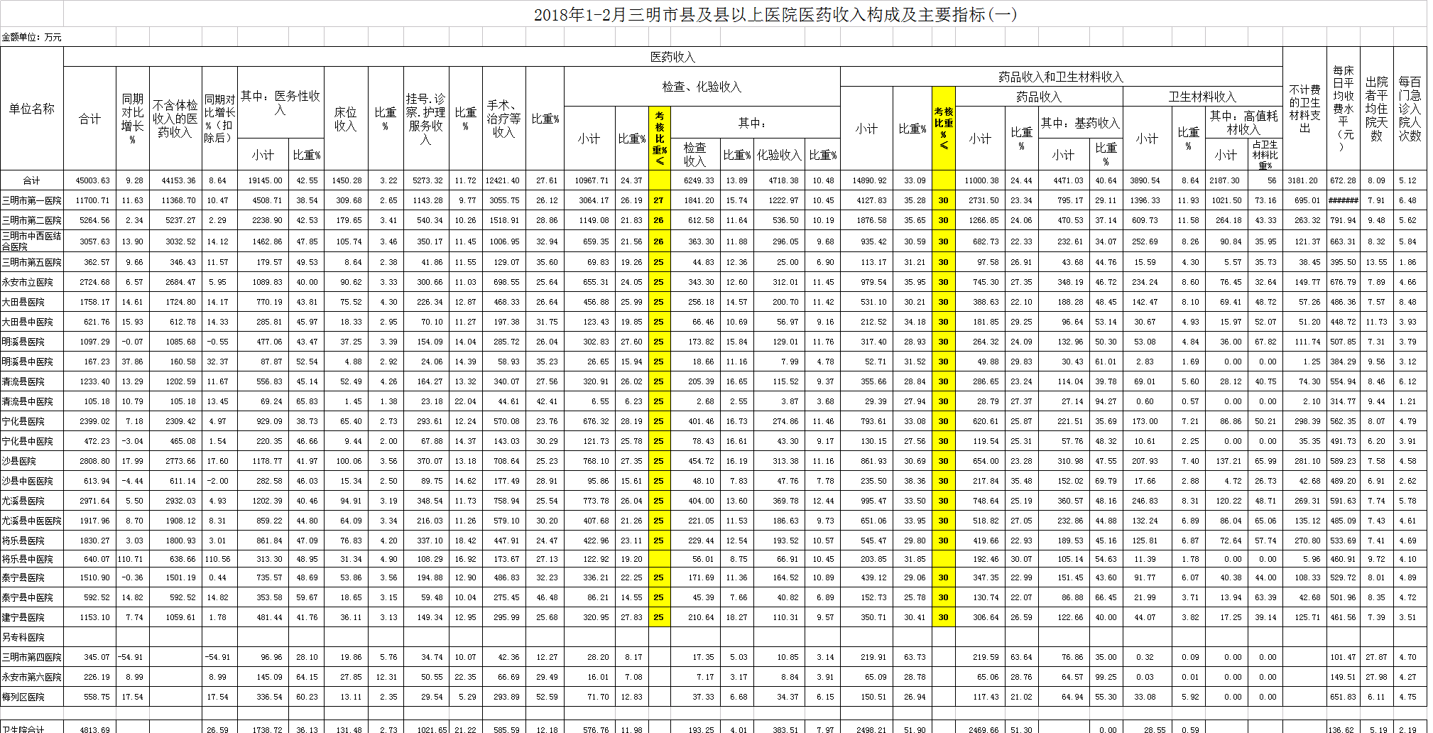 检查化验收入比。2月份22家县级以上医院检查化验收入占医药总收入的24.37%,比去年同期的27.89%,下降3.52个百分点,达标医院16家,超过核定数有6家医院,其中宁化县医院超过3.59个百分点、沙县医院超过3.24个百分点、明溪县医院超过2.58个百分点。
