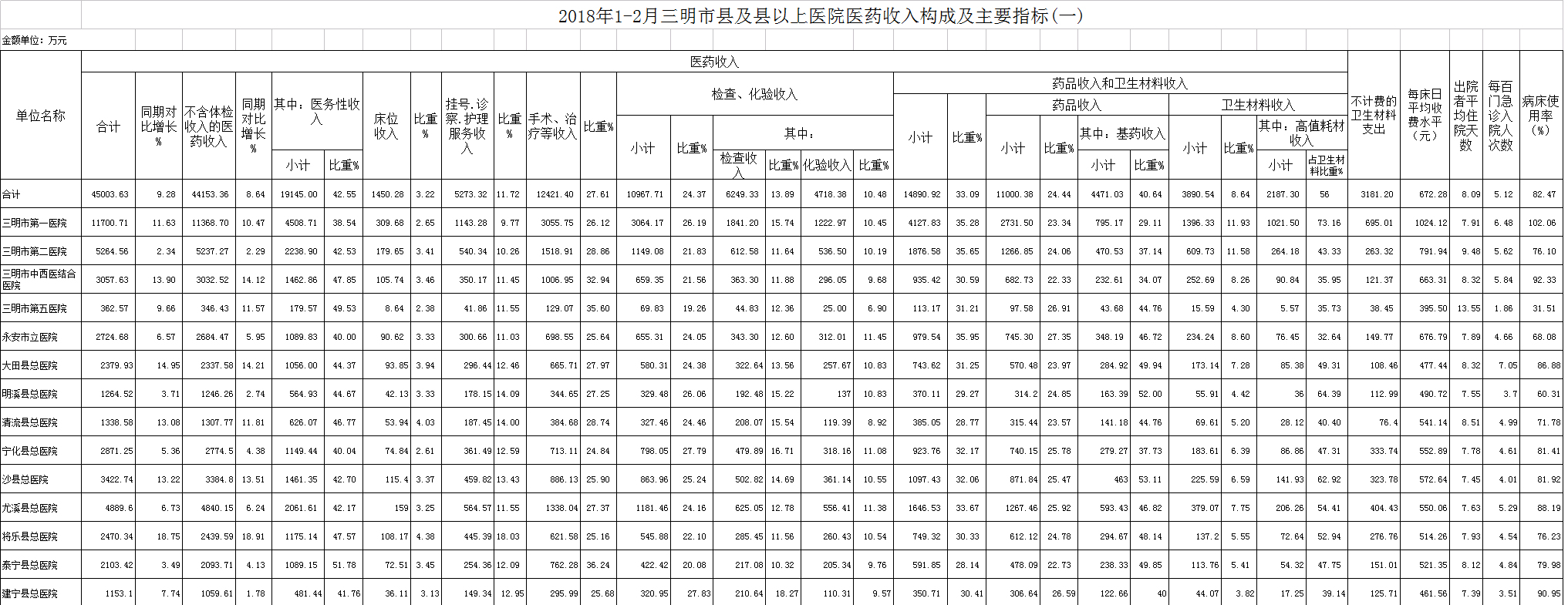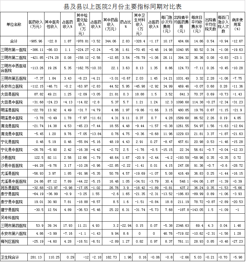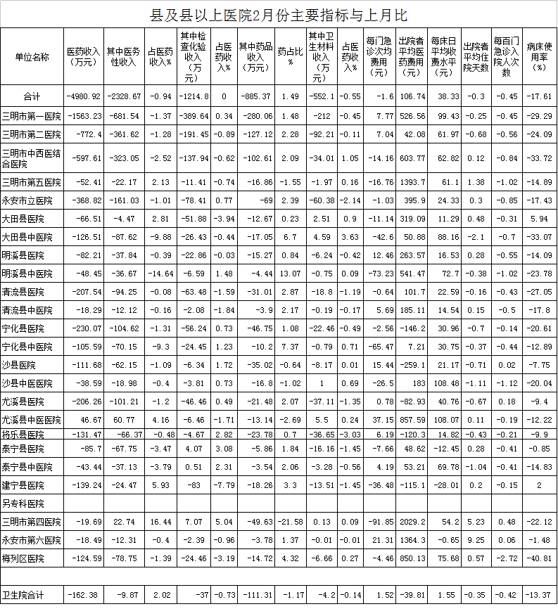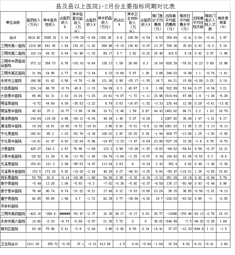 医药总收入。1-2月份22家县级以上医院医药总收入同比增长9.28%(不含体检收入的医药收入同比增长8.46%),增长超过8%有12家医院,其中将乐县医院同比增长110.71%、明溪县中医院37.86%、沙县中医院同比增长17.99%。