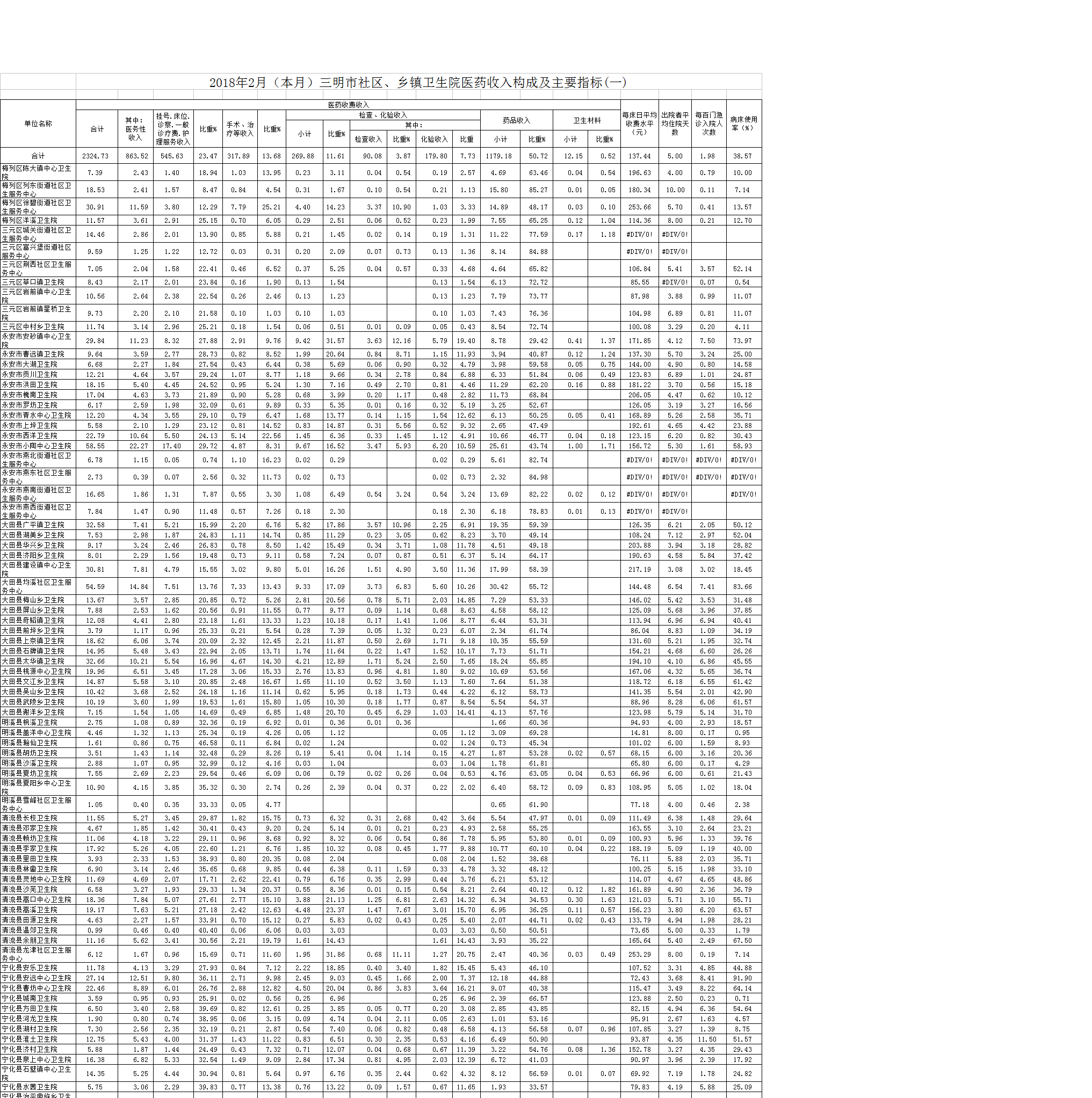 1-2月份基层医疗机构医药总收入4813.69万元(其中村所收入590.53万元),较去年同期3802.69万元,同比增加1011万元,增长26.59%,其中:医务性收入1738.72万元,占医药收入36.12%(床位收入131.48万元、手术治疗护理等服务收入1607.24万元),较去年同期1383万元, 医务性收入同比增加355.72万元,增长25.72%;检查化验收入576.76万元,同比上升6.87%;药品收入2469.66万元,较去年同期1856.08万元,同比增长613.58万元,增长33.06%,药占比51.3%,去年同期48.8%,同比增长2.5个百分点;卫生材料收入28.55万元,去年同期23.94万元,同比增加4.61万元,占医药收入0.59%,去年同期0.63%,同比下降0.04个百分点。入院人次15515人次,去年同期13769人次,同比增加1746人次,增长12.68%,其中梅列区、三元区、清流县分别下降32.11%、21.14%、11.48%;门急诊人次708481人次(其中村所门急诊231237人次),较去年同期529952人次,同比增加178529人次,增长33.69%;每门诊次均费用52.38元,去年同期54.02元,同比减少1.64元,下降3.04%;出院者平均费用709.06元,较去年同期676.52元,同比增加32.54元,增长4.81%。
