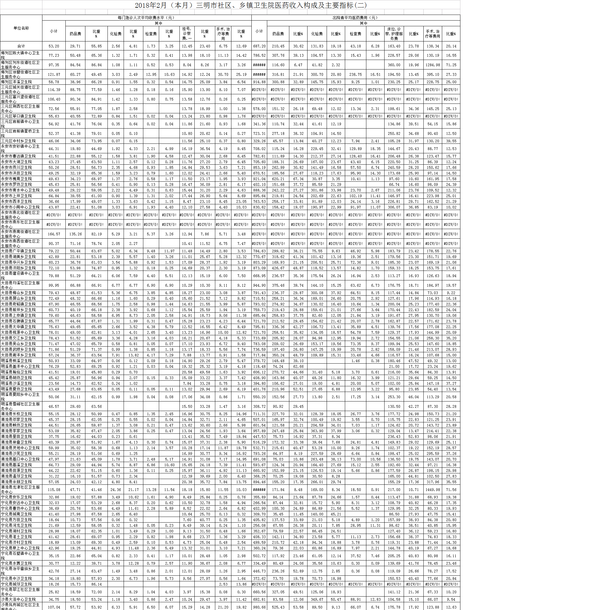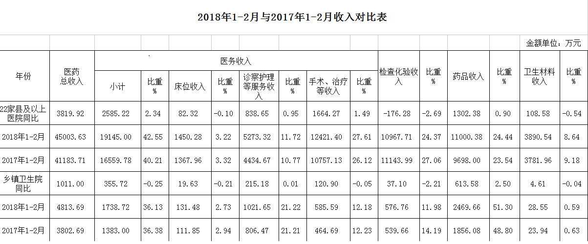 (一)1- 2月份22家县级以上医院:医药总收入45003.63万元,比去年同期41183.75万元增加3819.88万元,同比增长9.28%(不含体检收入的医药收入为44153.36万元,增长8.64%)。其中:医务性收入19145万元,占医药收入42.55%(床位收入1450.28万元、手术治疗护理等服务收入17694.72万元),比去年同期16559.78万元,医务性收入增加2585.22万元,增长15.61%;检查化验收入10967.71万元,同比下降1.58%;药品收入11000.38万元,药占比24.44%,分别比去年同期增长13.43%、上升0.9个百分点;卫生材料收入3890.54万元(其中高值耗材收入2187.3 万元),占医药总收入8.64%,比去年同期9.18%,下降0.54个百分点。入院人次51390人次,比去年同期49674人次,增加1716人次,增长3.45%;门急诊人次1002769人次,比去年同期897004人次,增加105765人次,增长11.79%;每门诊次均费用171.25元,比去年同期162.72元,增加8.53元,增长5.24%;出院者平均费用5438.75元,比去年同期5078.81元,增加359.94元,增长7.09%。