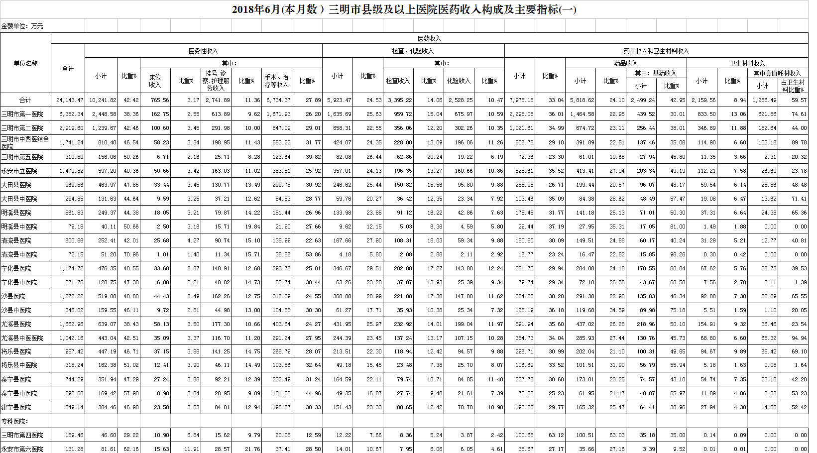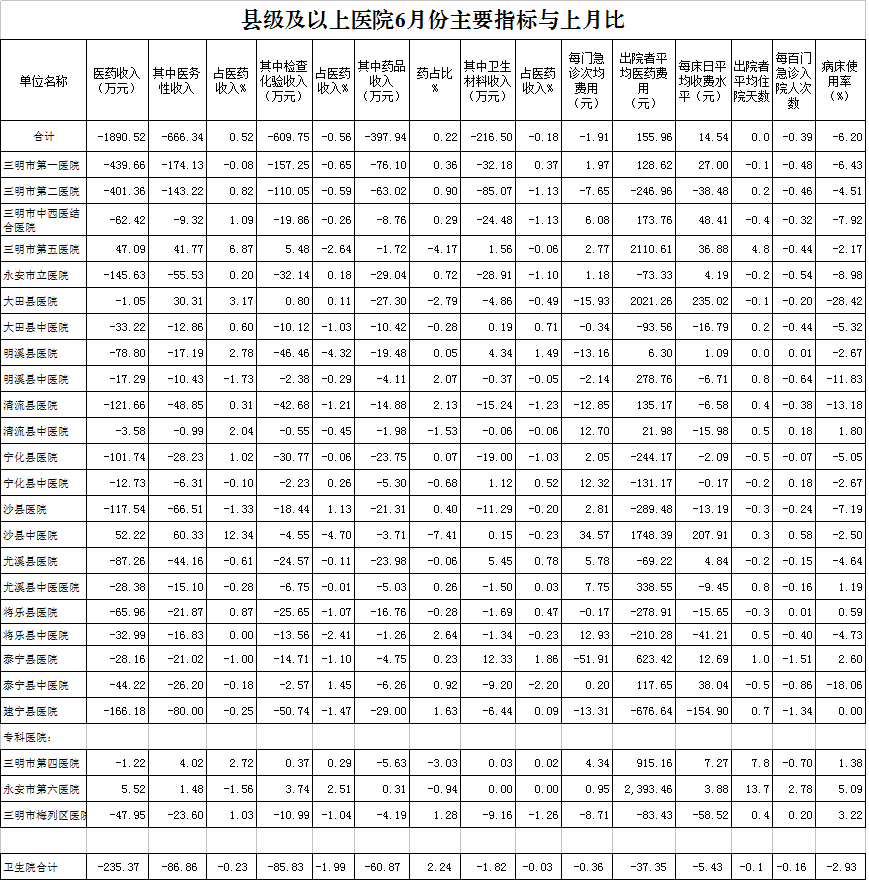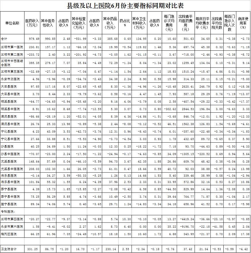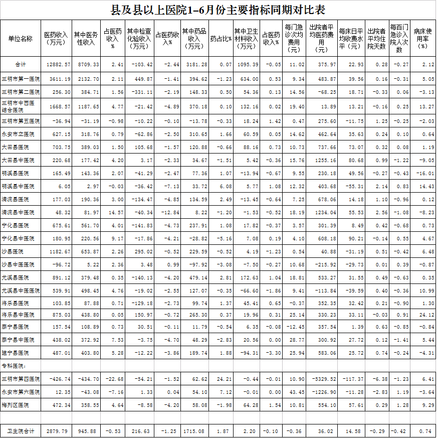 医药总收入。1-6月份22家县级以上医院医药总收入同比增长9.58%(不含体检收入的医药收入同比增长9.46%),增长超过8%有13家医院,其中将乐县中医院同比增长74.4%、泰宁县中医院28.67%、三明市中西医结合医院同比增长19.21%。