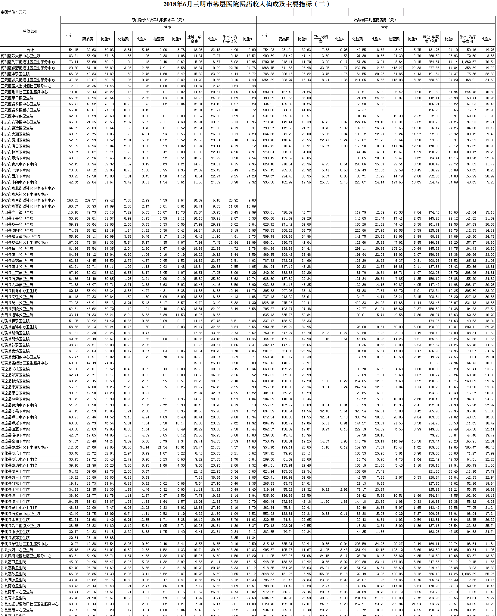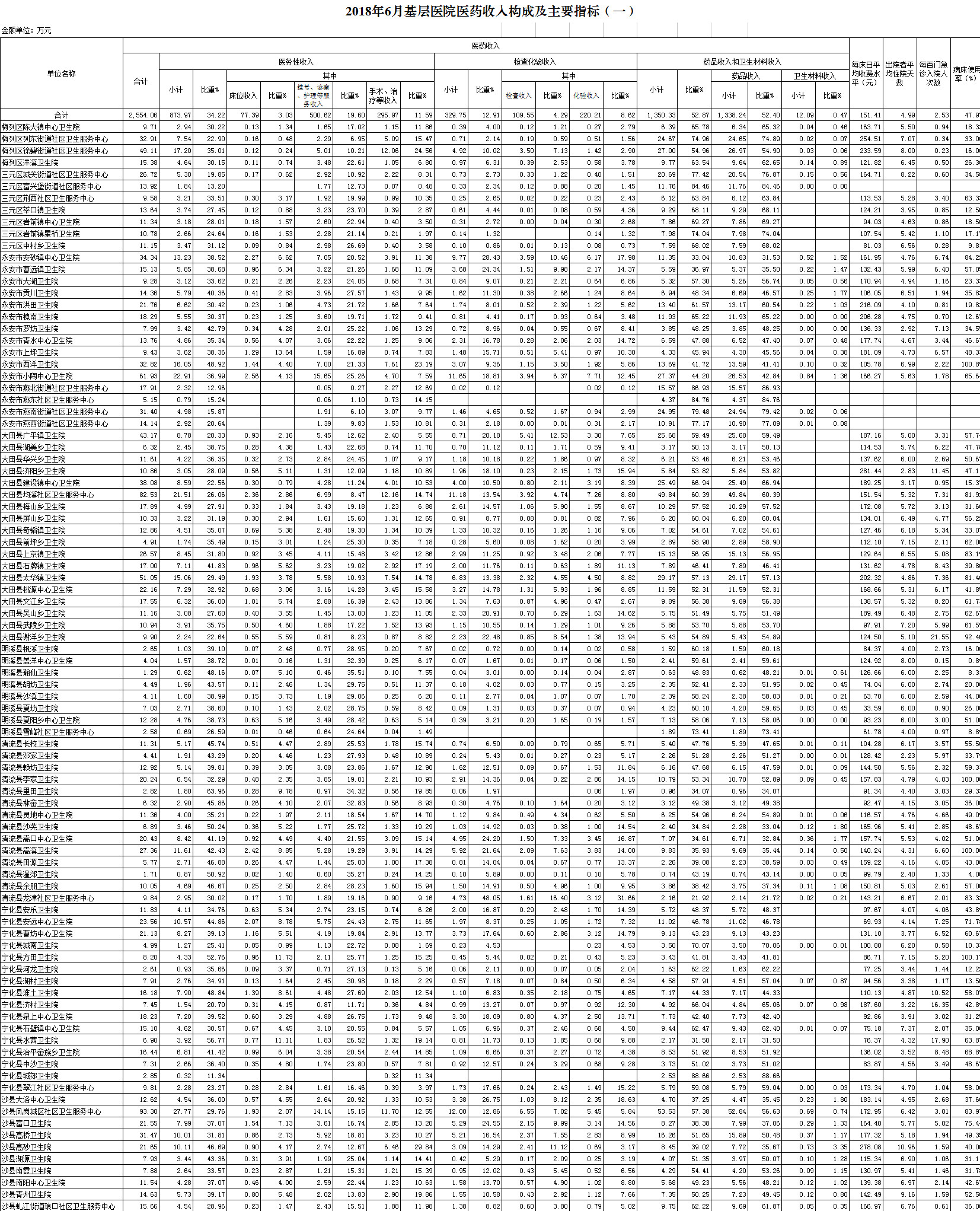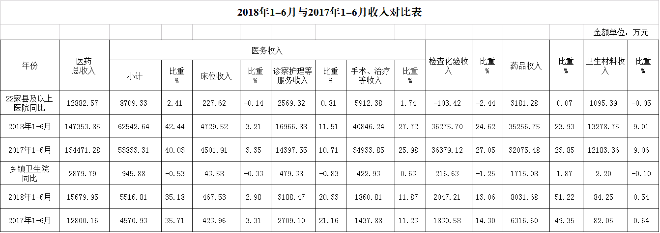 (一)1- 6月份22家县级以上医院:医药总收入147353.85万元,比去年同期134471.28万元增加12882.57万元,增长9.58%(不含体检收入的医药收入为144424.67万元,比去年同期增长9.46%)。其中:医务性收入62542.64万元,占医药收入42.44%(床位收入4729.52万元、手术治疗护理等服务收入57813.12万元),比去年同期53833.31万元,医务性收入增加8709.33万元,增长16.18%;检查化验收入36275.70万元,同比下降0.28%;药品收入35256.75万元,药占比23.93%,分别比去年同期增长9.92%、增长0.07个百分点;卫生材料收入13278.75万元(其中高值耗材收入7516.80万元),占医药总收入9.01%,比去年同期9.06%,下降0.05个百分点。入院人次159490人次,比去年同期157786人次,增加1704人次,增长1.08%;门急诊人次3165124人次,比去年同期2971741人次,增加193383人次,增长6.51%;每门诊次均费用174.83元,比去年同期163.81元,增加11.02元,增长6.73%;出院者平均费用5656.51元,比去年同期5280.55元,增加375.97元,增长7.12%。