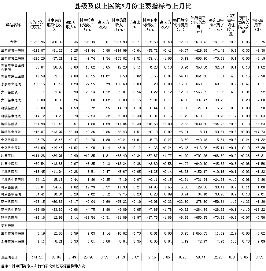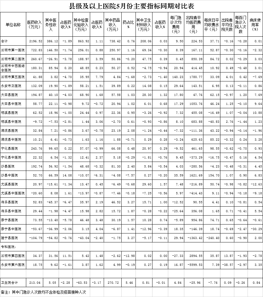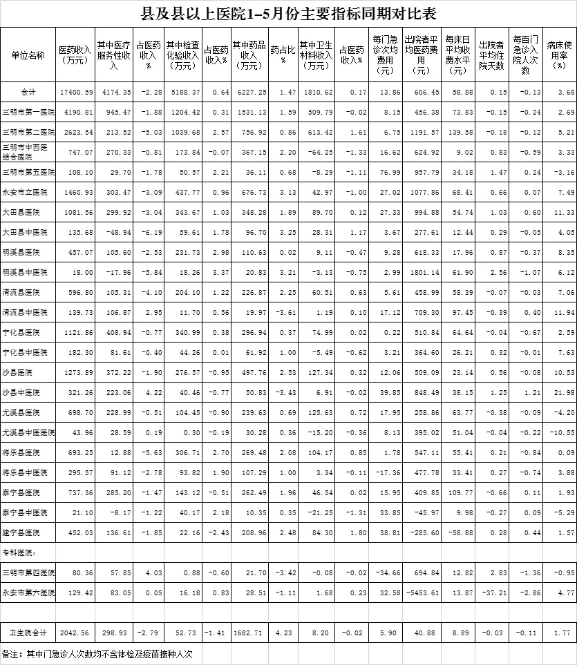 1-5月份基层医疗机构医药总收入15167.49万元(其中村所收入2020.43万元),去年同期13124.93万元,同比增加2042.56万元,增长15.56%,其中:医疗服务性收入4941.76万元,占医药收入32.58%(床位收入403.76万元、手术治疗护理等服务收入4538.00万元),去年同期4642.84万元, 医疗服务性收入同比增加298.93万元,增长6.44%;检查化验收入1769.22万元,同比增长3.07%;药品收入8376.14万元,去年同期6693.44万元,同比增加1682.71万元,增长25.14%,药占比55.22%,去年同期51.00%,同比增长4.23个百分点;卫生材料收入80.36万元,较去年同期72.16万元,同比增加8.20万元,占医药收入0.53%,较去年同期0.55%,同比下降0.02个百分点。入院人次45612人次,去年同期44762人次,同比增加850人次,增长1.90%,其中大田县、沙县、梅列区分别下降24.12%、21.07%、10.34%、;门急诊人次1966556人次(其中村所门急诊716926人次),去年同期1842113人次,同比增加124443人次,增长6.76%;每门诊次均费用58.96元,去年同期53.09元,同比增加5.87元,增长11.06%;出院者平均费用786.96元,去年同期746.08元,同比增加40.88元,增长5.48%。