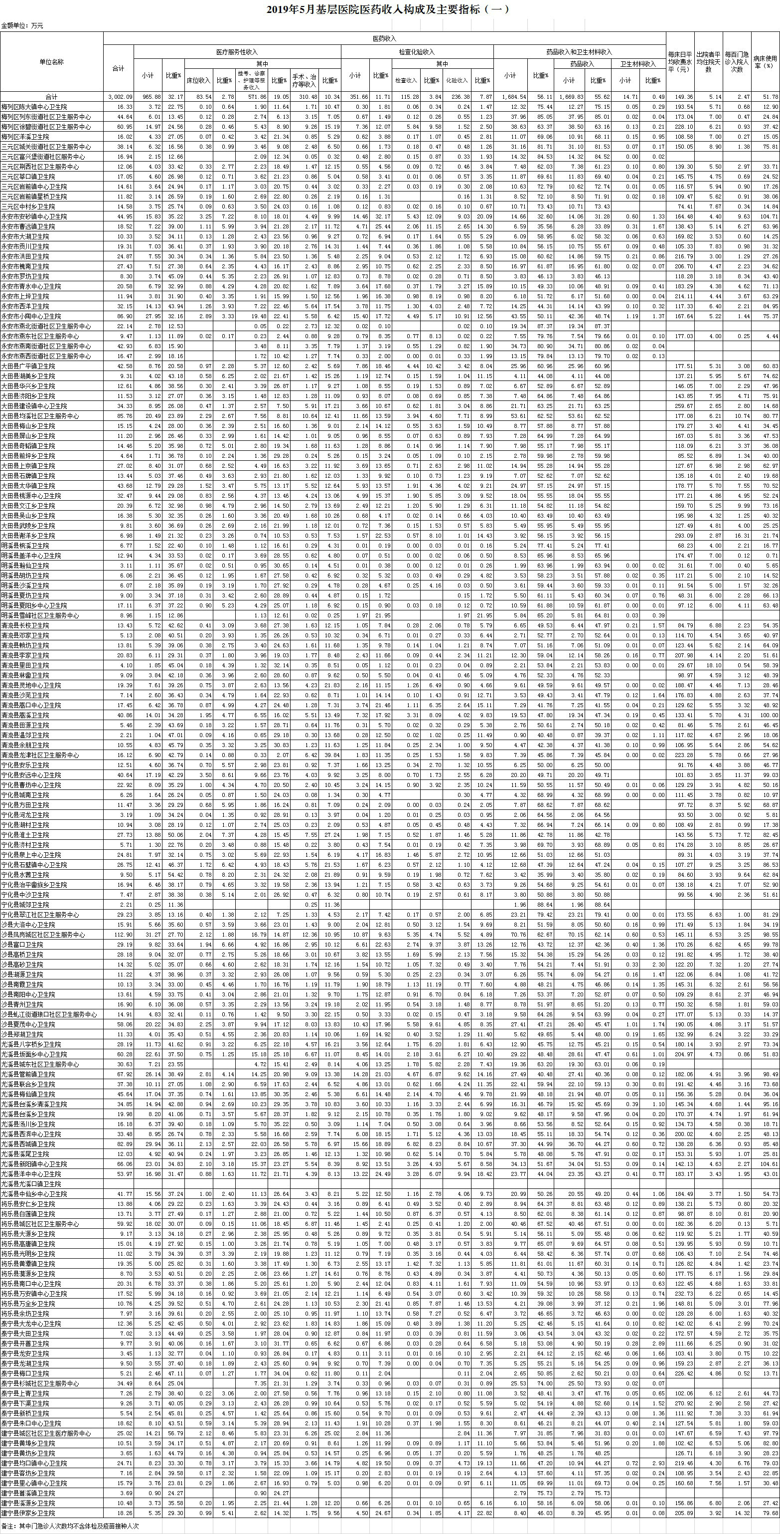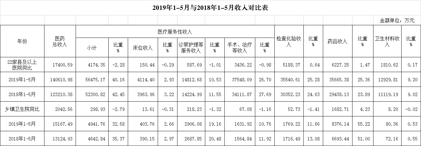 (一)1-5月份12家总医院:医药总收入140610.98万元,比去年同期123210.38万元增加17400.59万元,增长14.12%(不含体检收入的医药收入为138339.38万元,比去年同期增长14.57%)。其中:医疗服务性收入56475.17万元,占医药收入40.16%(床位收入4114.40万元、手术治疗护理等服务收入52360.77万元),比去年同期52300.82万元,医疗服务性收入增加4174.35万元,增长7.98%;检查化验收入35540.61万元,同比增长17.09%;药品收入35665.38万元,药占比25.36%,分别比去年同期增长21.15%、增长1.47个百分点;卫生材料收入12929.81万元(其中高值耗材收入8072.56万元),占医药总收入9.20%,比去年同期9.02%,增长0.17个百分点。入院人次138935人次,比去年同期134713人次,增加4222人次,增长3.13%;门急诊人次2797958人次,比去年同期2641282人次,增加156676人次,增长5.93%;每门诊次均费用188.63元,比去年同期174.77元,增加13.86元,增长7.93%;出院者平均费用6220.34元,比去年同期5613.89元,增加606.45元,增长10.80%。