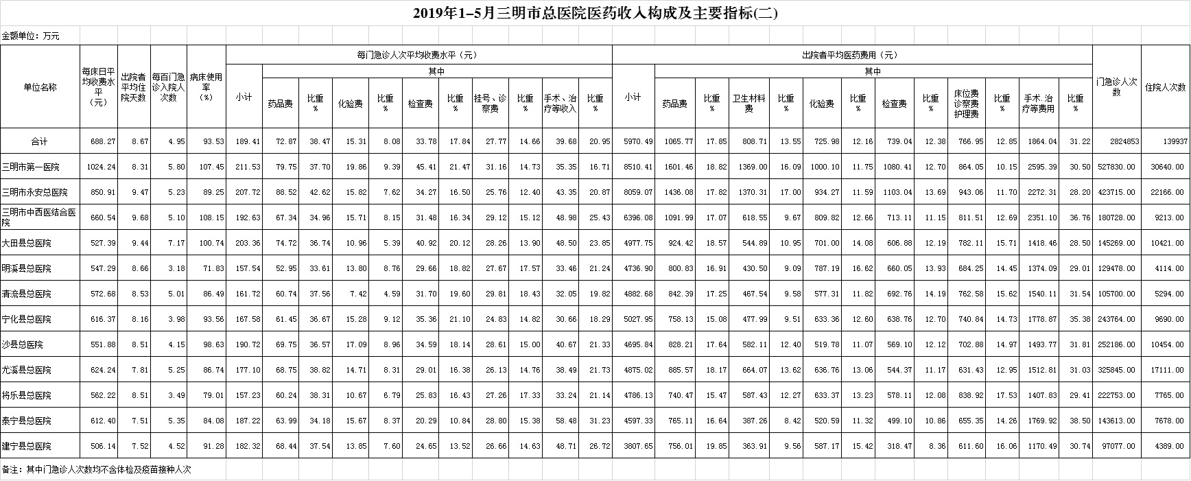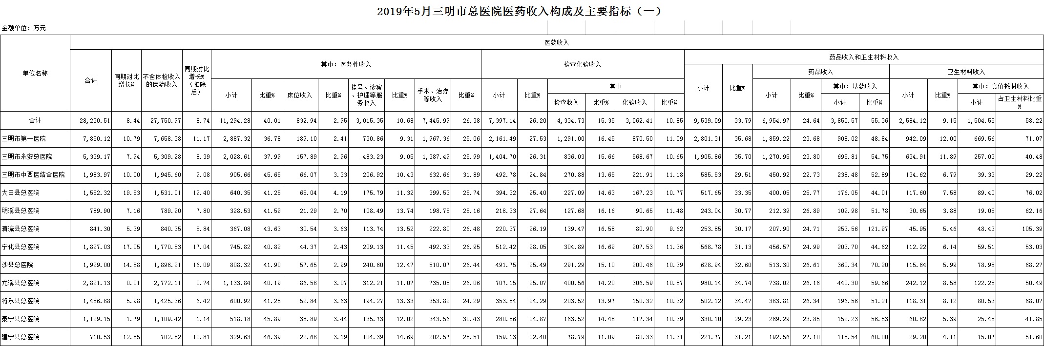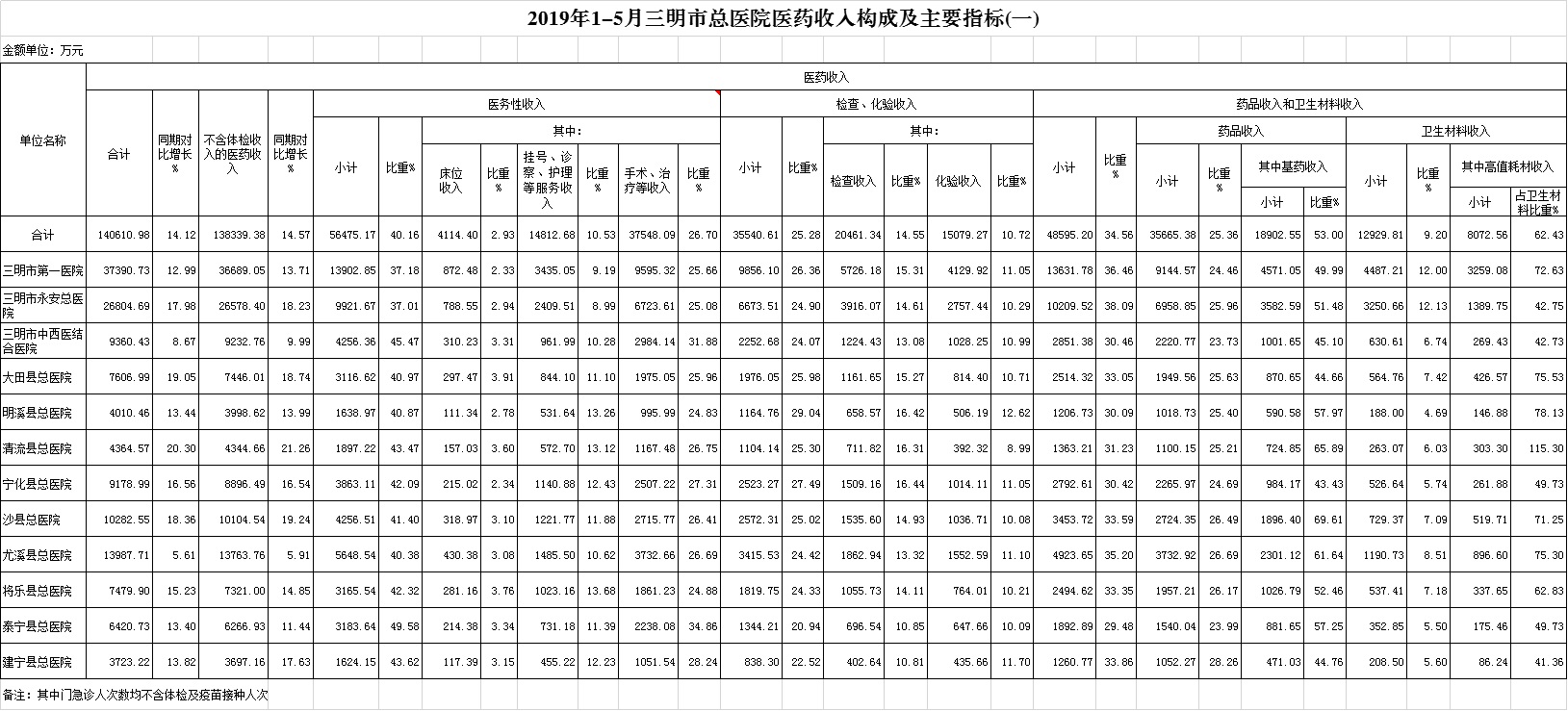 医药总收入。1-5月份12家总医院医药总收入同比增长14.12%(不含体检收入的医药收入同比增长14.57%),增长率超过考核要求(三级医院考核要求为12%,二级医院考核要求为10%)的有10家医院,其中清流县总医院同比增长20.3%、大田县总医院同比增长19.05%、沙县总医院同比增长18.36%。