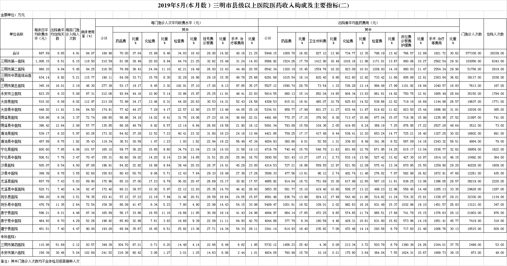 药品与卫生材料占比。5月份12家总医院药品与卫生材料收入占医药总收入的33.79% ,比去年同期33.01%,增长0.78个百分点。达标医院2家,超过核定指标有10家医院,其中永安总医院超过5.7个百分点、三明市第一医院超过5.68个百分点、尤溪县总医院超过4.74个百分点。