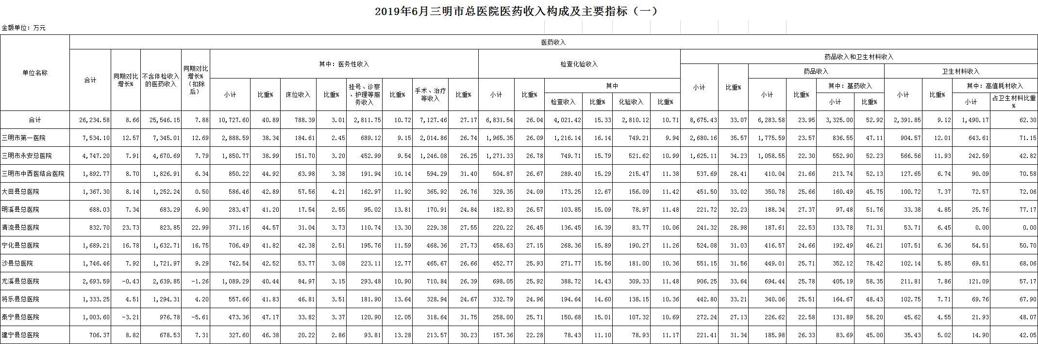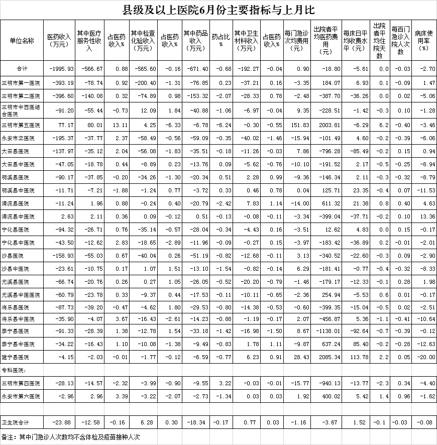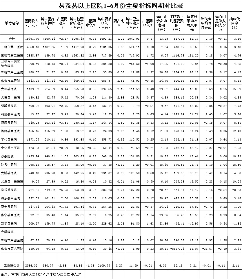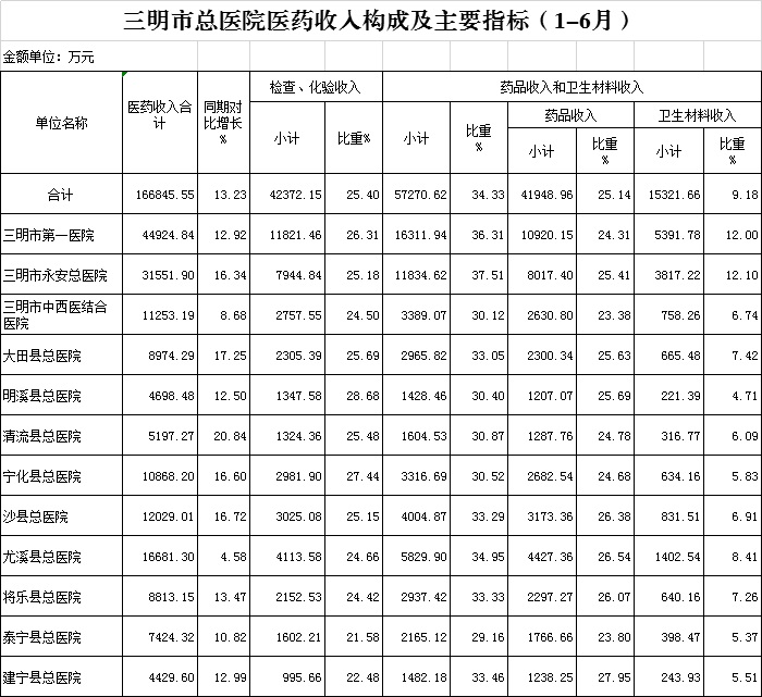 医药总收入。1-6月份12家总医院医药总收入同比增长13.23%(不含体检收入的医药收入同比增长13.47%),增长率超过考核要求(三级医院考核要求为12%,二级医院考核要求为10%)的有10家总医院,其中清流县总医院同比增长20.84%、大田县总医院同比增长17.25%、沙县总医院同比增长16.72%。