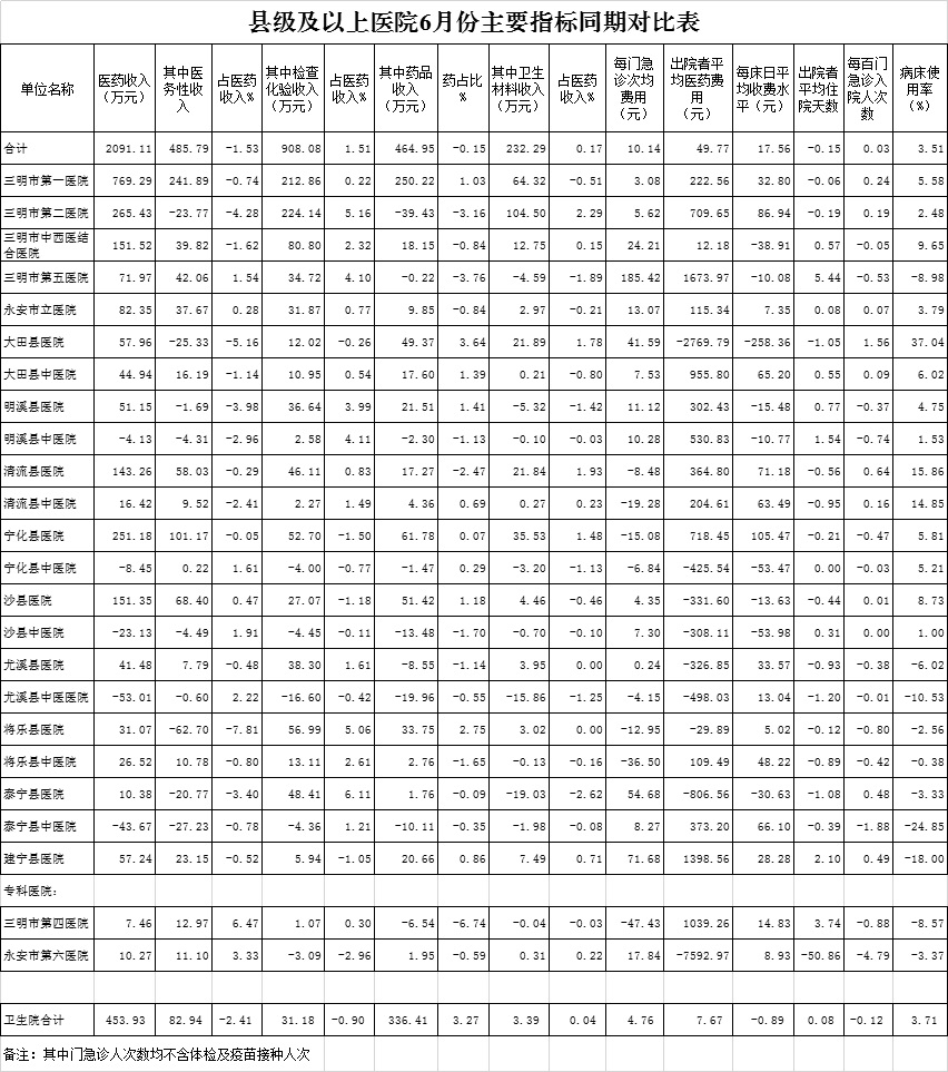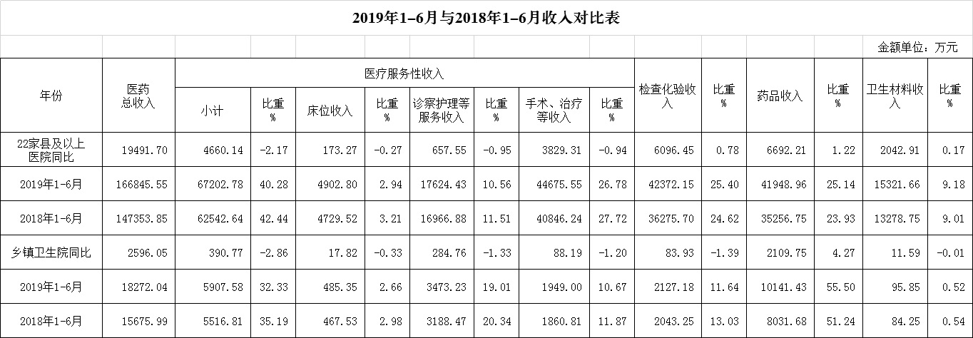 1.医药收入:6月份12家总医院医药总收入26234.58万元,比去年同期24143.47万元,增加2091.11万元,增长8.66%。其中:医疗服务性收入10727.60万元,占医药收入40.89%(床位收入788.39万元、手术治疗护理等服务收入9939.21万元),比去年同期10241.82万元, 医疗服务性收入增加485.79万元,增长4.74%;药品收入6283.58万元,比去年同期5818.62万元,增加464.95万元,增长7.99%。