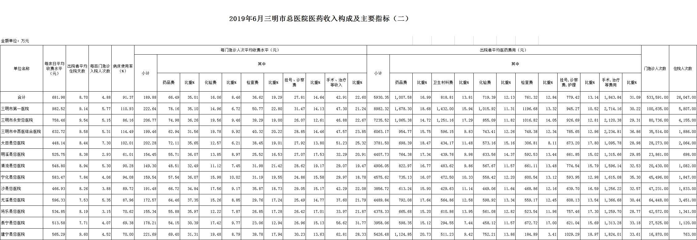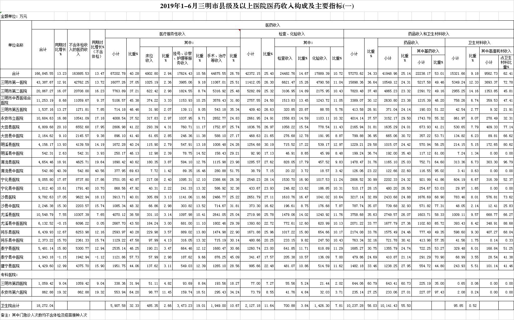 (一)1-6月份12家总医院:医药总收入166845.55万元,比去年同期147353.85万元增加19491.70万元,增长13.23%(不含体检收入的医药收入为163885.53万元,比去年同期增长13.47%)。其中:医疗服务性收入67202.78万元,占医药收入40.28%(床位收入4902.80万元、手术治疗护理等服务收入62299.98万元),比去年同期62542.64万元,医疗服务性收入增加4660.14万元,增长7.45%;检查化验收入42372.15万元,同比增长16.81%;药品收入41948.96万元,药占比25.14%,分别比去年同期增长18.98%、增长1.22个百分点;卫生材料收入15321.66万元(其中高值耗材收入9498.88万元),占医药总收入9.18%,比去年同期9.01%,增长0.17个百分点。入院人次164982人次,比去年同期159490人次,增加5492人次,增长3.44%;门急诊人次3331549人次,比去年同期3151682人次,增加179867人次,增长5.71%;每门诊次均费用188.83元,比去年同期175.58元,增加13.25元,增长7.55%;出院者平均费用6173.52元,比去年同期5656.51元,增加517.01元,增长9.14%。