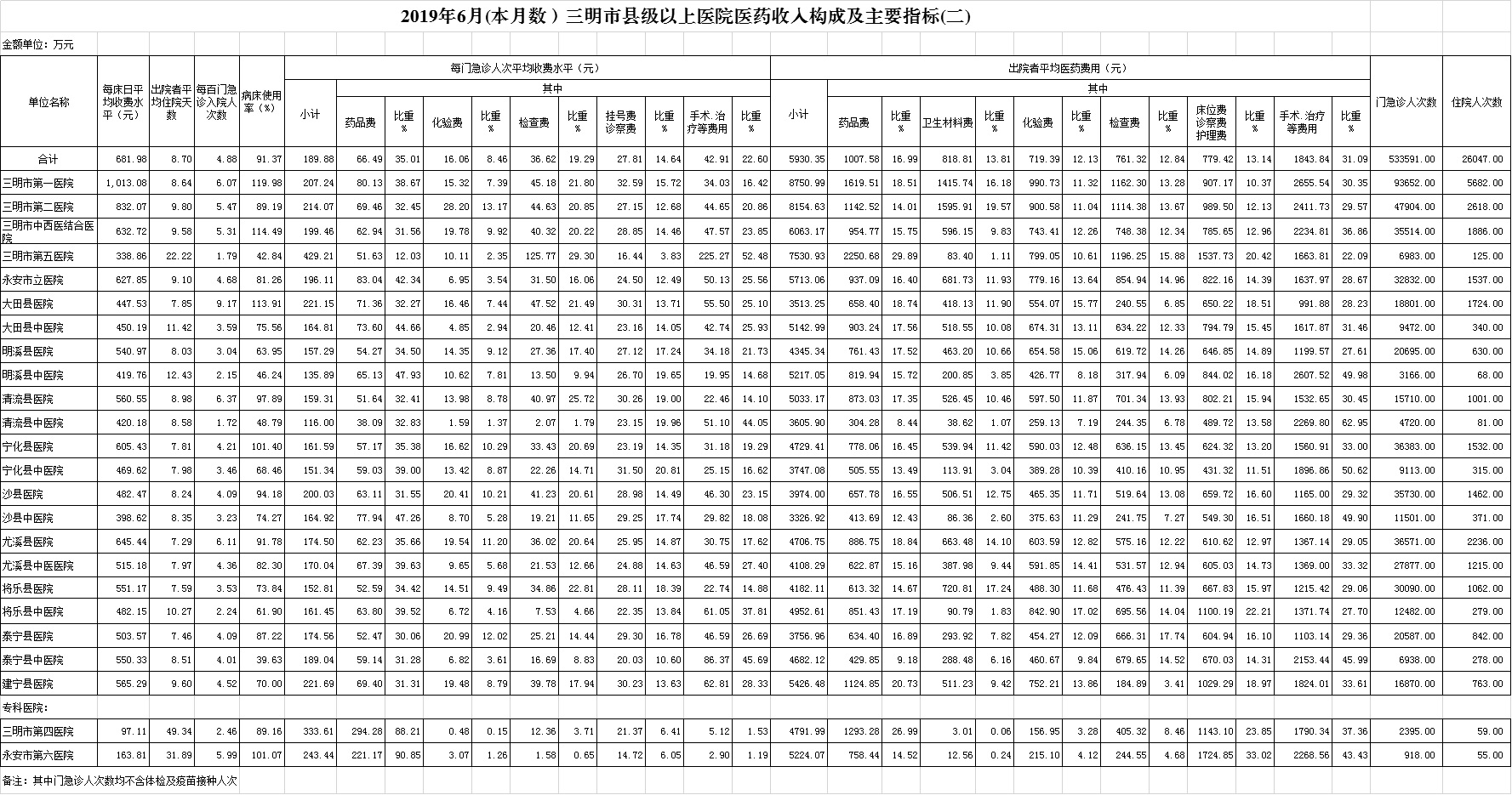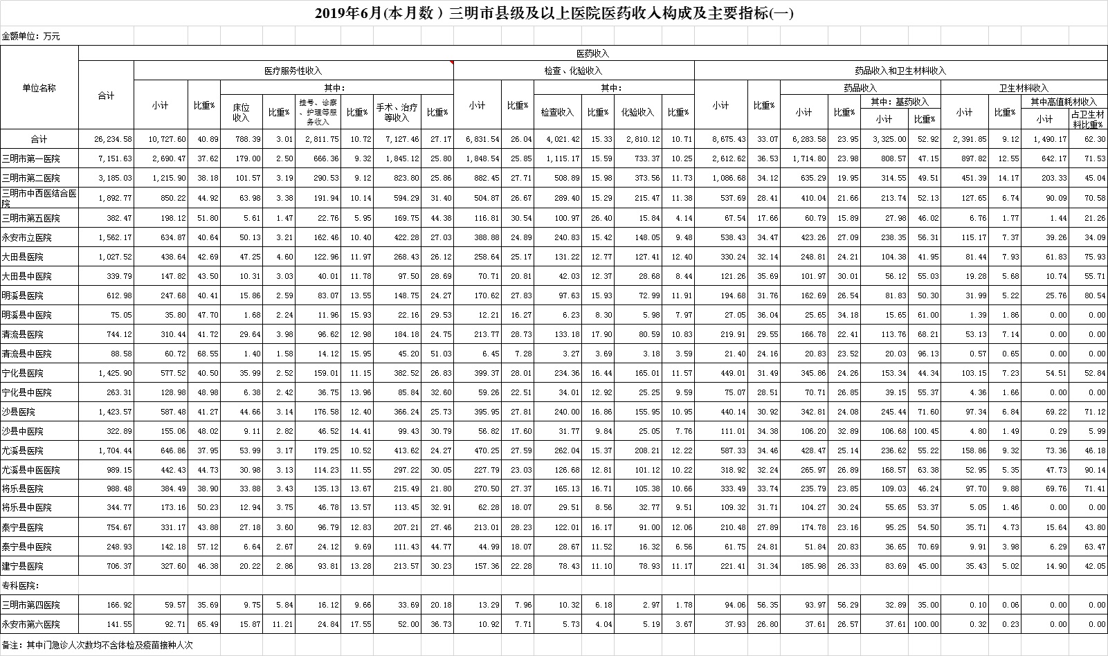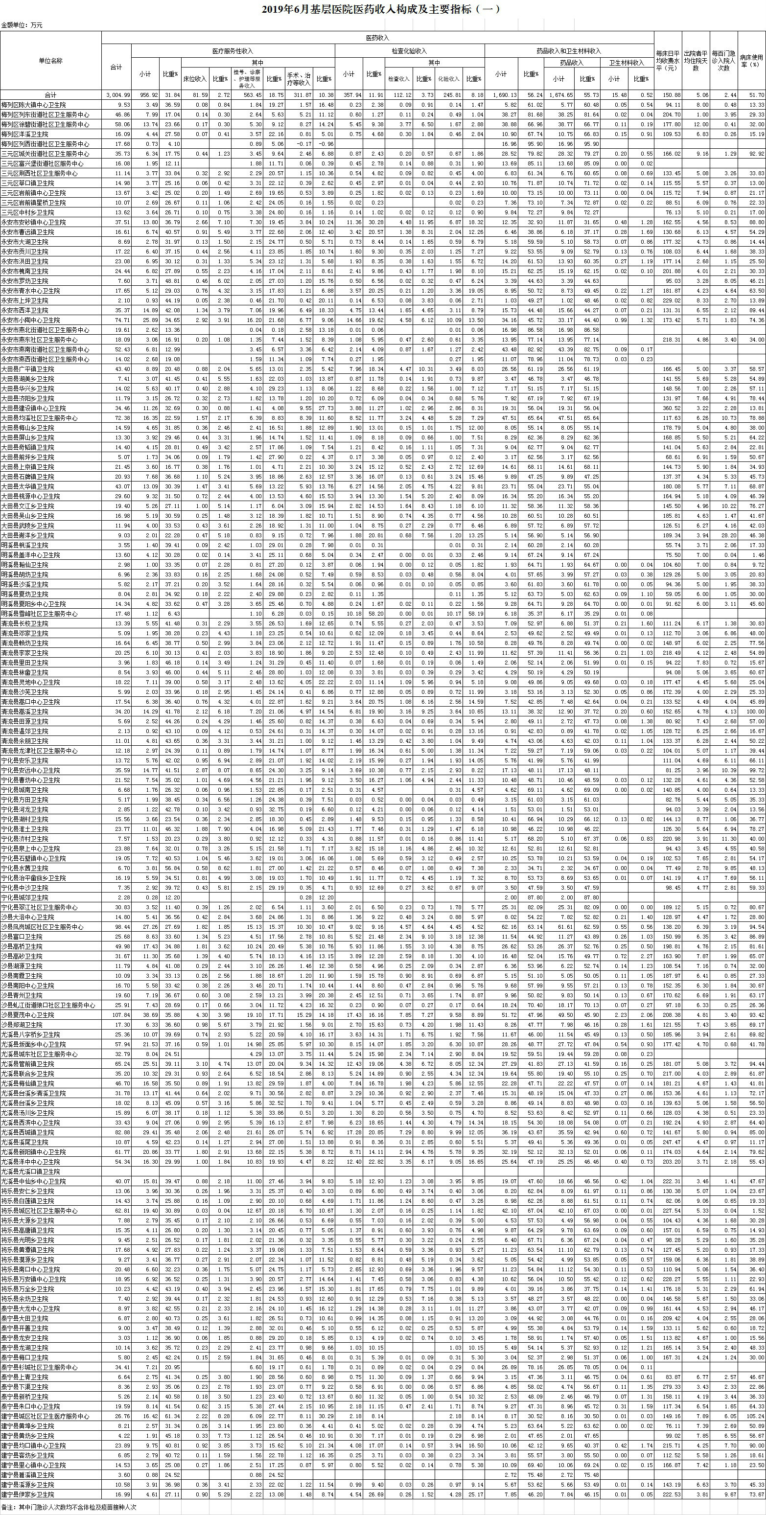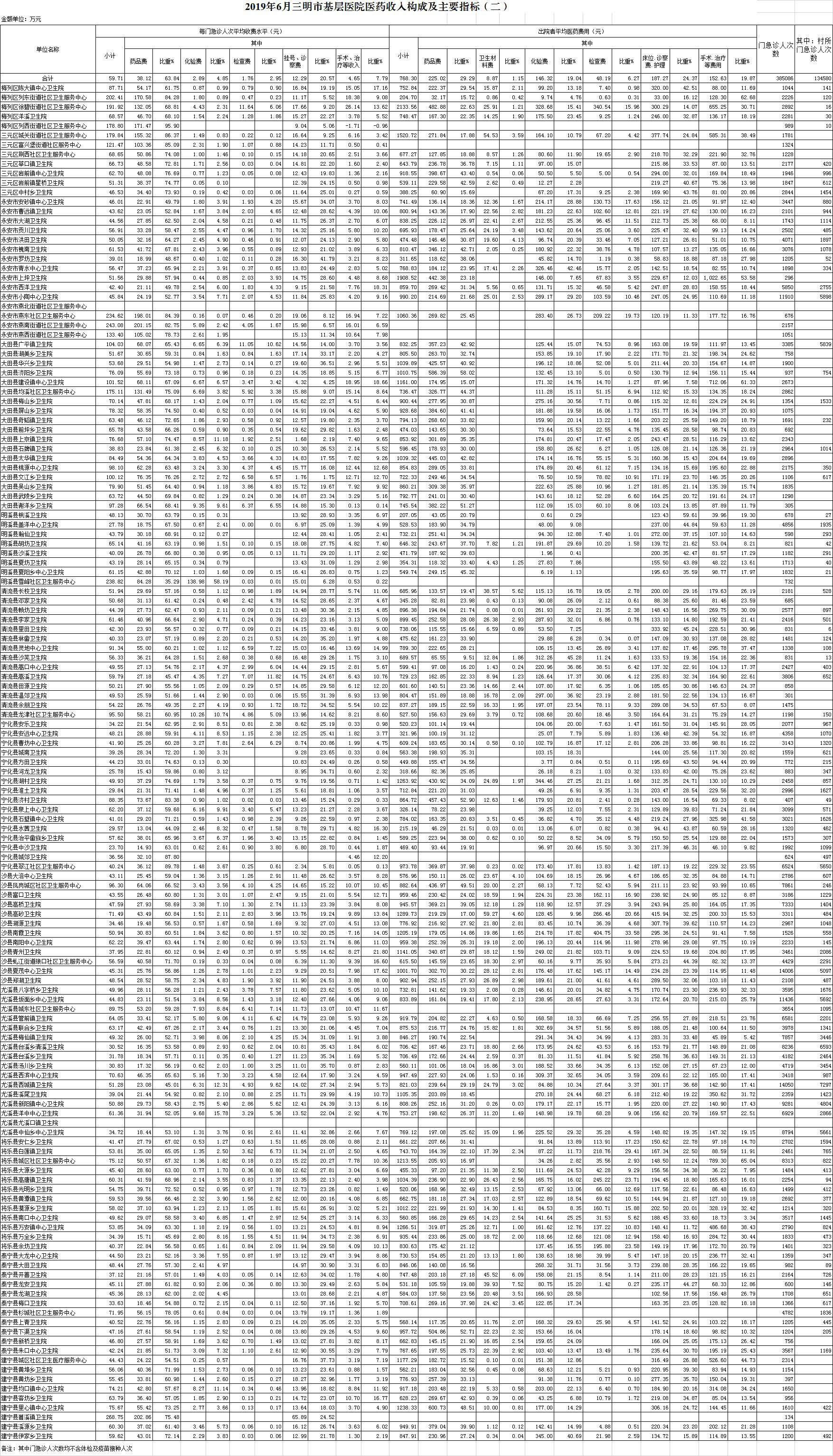 1-6月份基层医疗机构医药总收入18272.04万元(其中村所收入2371.04万元),去年同期15675.99万元,同比增加2596.05万元,增长16.56%,其中:医疗服务性收入5907.58万元,占医药收入32.33%(床位收入485.35万元、手术治疗护理等服务收入5422.23万元),去年同期5516.81万元, 医疗服务性收入同比增加390.77万元,增长7.08%;检查化验收入2127.18万元,同比增长4.11%;药品收入10141.43万元,去年同期8031.68万元,同比增加2109.75万元,增长26.27%,药占比55.50%,去年同期51.24%,同比增长4.27个百分点;卫生材料收入95.85万元,较去年同期84.25万元,同比增加11.59万元,占医药收入0.52%,较去年同期0.54%,同比下降0.01个百分点。入院人次54989人次,去年同期53569人次,同比增加1420人次,增长2.65%,其中将乐县、尤溪县、沙县分别下降10.43%、4.91%、1.88%、;门急诊人次2355809人次(其中村所门急诊851540人次),去年同期2186841人次,同比增加168968人次,增长7.73%(基层诊疗量占比为41.42%,较去年同期的40.96%增长0.46个百分点);每门诊次均费用59.40元,去年同期53.38元,同比增加6.02元,增长11.27%;出院者平均费用782.80元,去年同期747.67元,同比增加35.13元,增长4.70%。