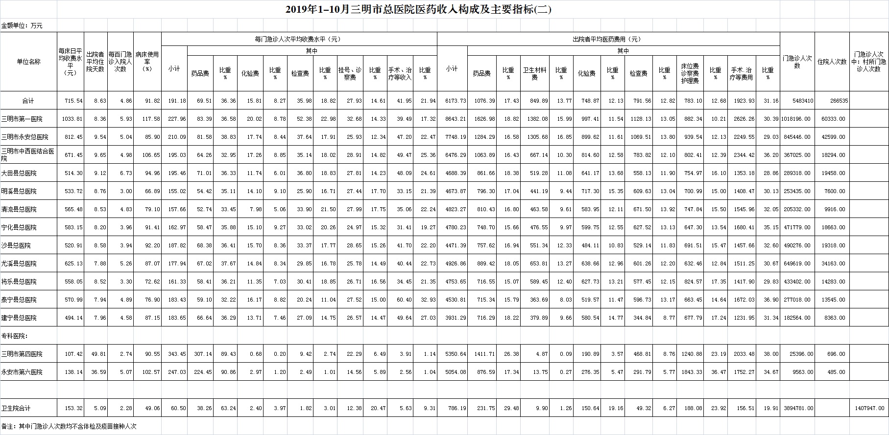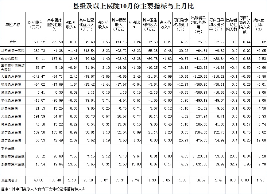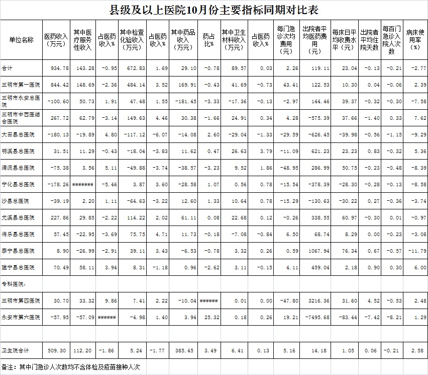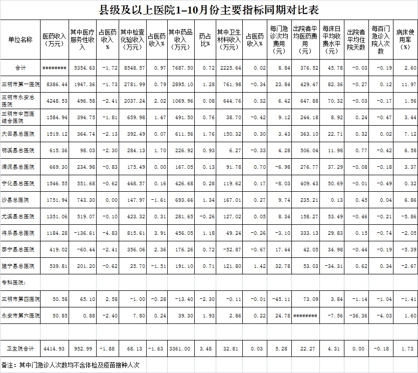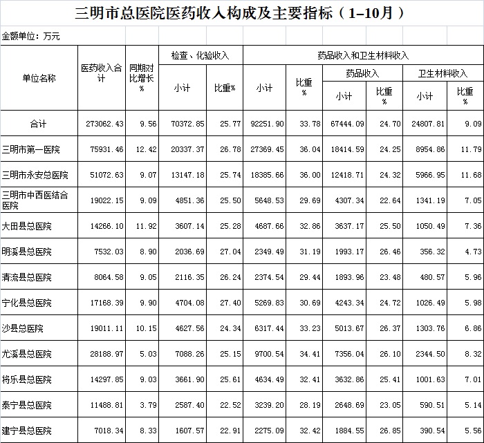 医药总收入。1-10月份12家总医院医药总收入同比增长9.56%(不含体检收入的医药收入同比增长9.55%),增长率超过考核要求(三级医院考核要求为12%,二级医院考核要求为10%)的有3家总医院,其中大田县总医院同比增长11.92%、三明市第一医院同比增长12.42%、沙县总医院同比增长10.15%。