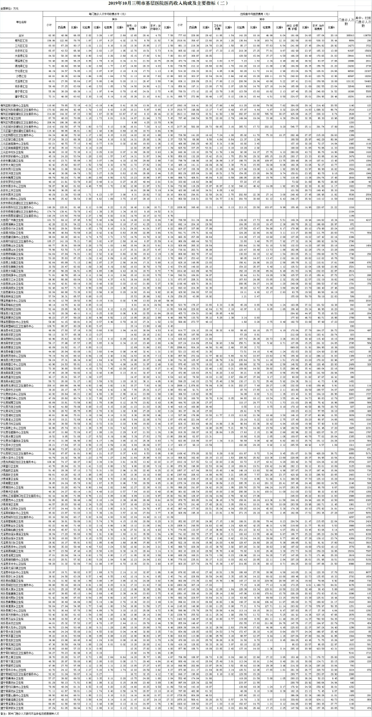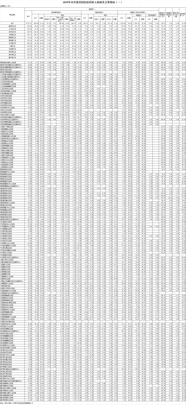 1-10月份基层医疗机构医药总收入30506.68万元(其中村所收入3633.60万元),去年同期26091.75万元,同比增加4414.93万元,增长16.92%,其中:医疗服务性收入9980.24万元,占医药收入32.71%(床位收入795.23万元、手术治疗护理等服务收入9185.01万元),去年同期9027.25万元, 医疗服务性收入同比增加952.99万元,增长10.56%;检查化验收入3408.98万元,同比增长2.04%;药品收入16949.49万元,去年同期13588.49万元,同比增加3361.00万元,增长24.73%,药占比55.56%,去年同期52.08%,同比增长3.48个百分点;卫生材料收入167.97万元,较去年同期135.16万元,同比增加32.81万元,占医药收入0.55%,较去年同期0.52%,同比增长0.03个百分点。入院人次88951人次,去年同期86982人次,同比增加1969人次,增长2.26%,其中梅列区、大田县、清流县分别下降25.86%、14.06%、9.8%、;门急诊人次3894781人次(其中村所门急诊1407947人次),去年同期3529049人次,同比增加365732人次,增长10.36%(基层诊疗量占比为41.53%,较去年同期的40.53%增长1个百分点);每门诊次均费用60.50元,去年同期55.24元,同比增加5.26元,增长9.52%;出院者平均费用780.95元,去年同期758.67元,同比增加22.27元,增长2.94%。