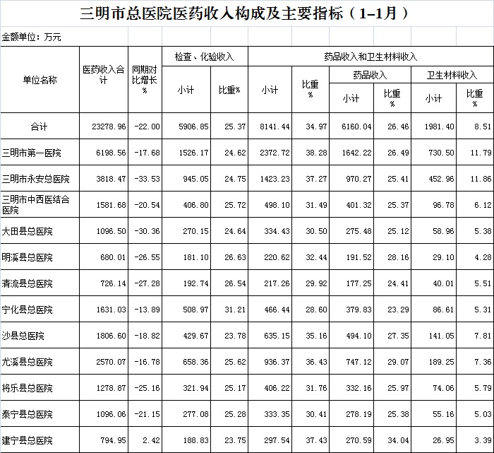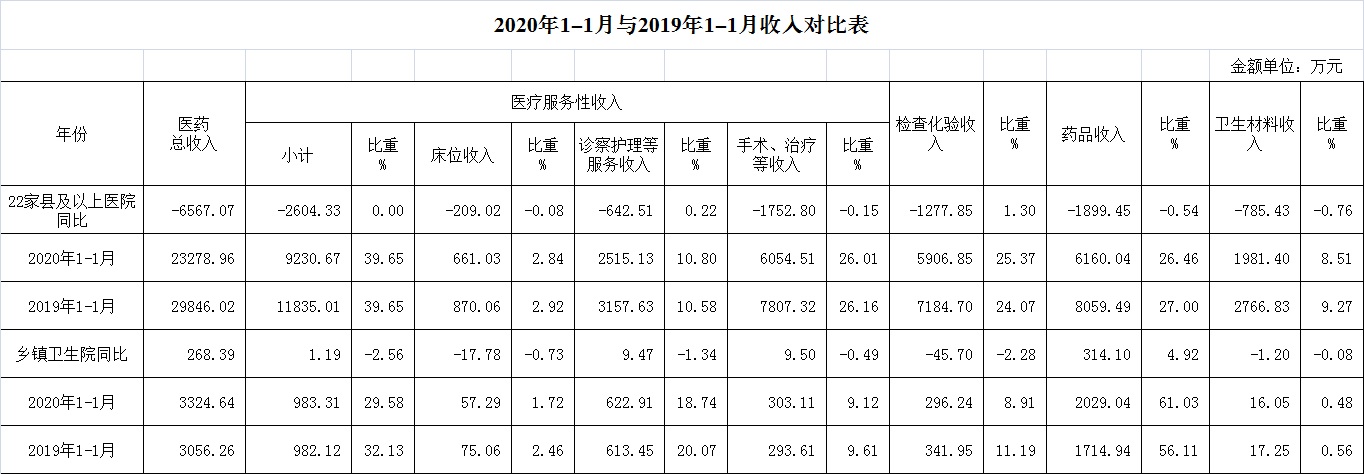 (一)1月份12家总医院运行情况:医药总收入23278.96万元,比去年同期29846.02万元减少6567.07万元,下降22.00%(不含体检收入的医药收入为22858.57万元,比去年同期下降22.18%)。