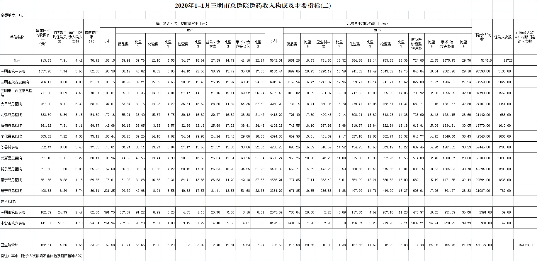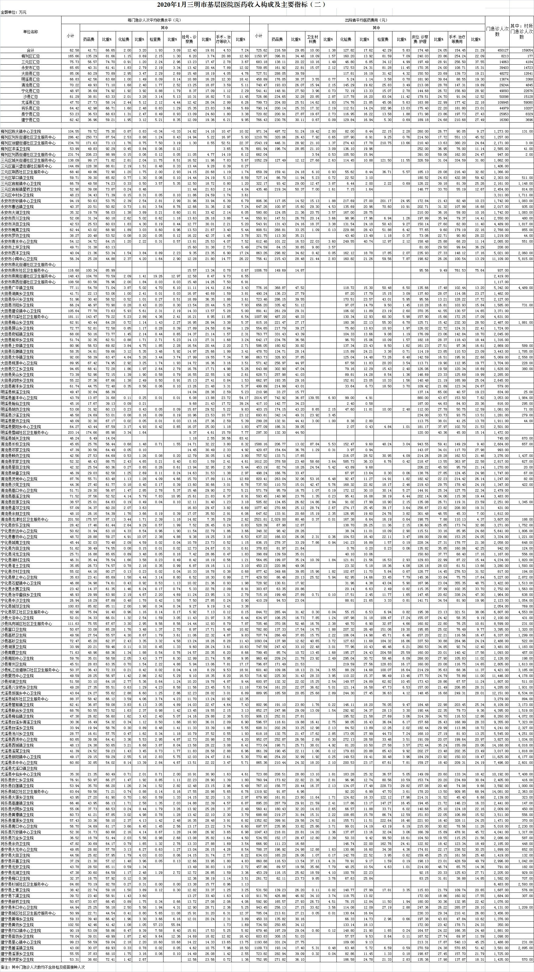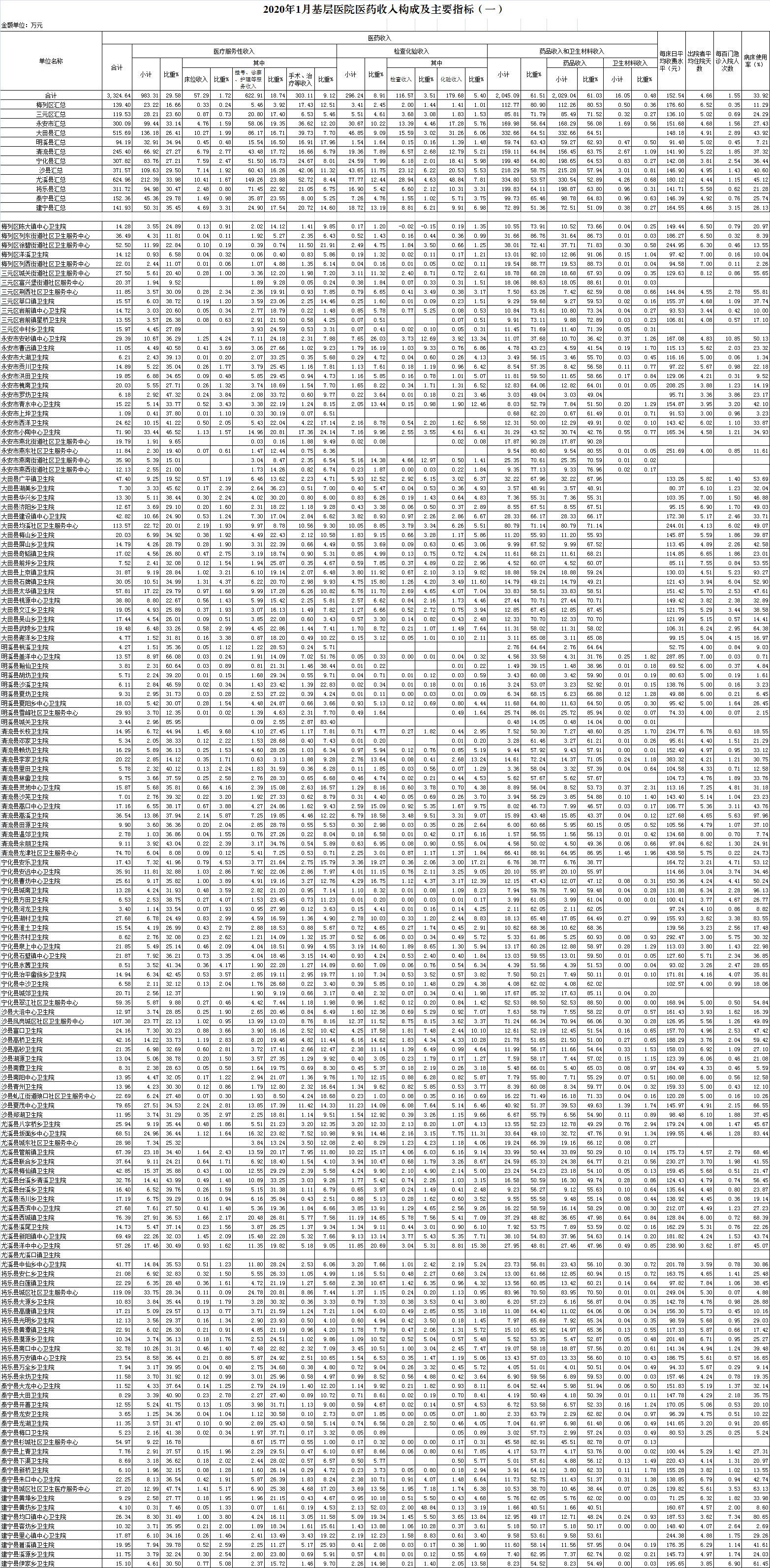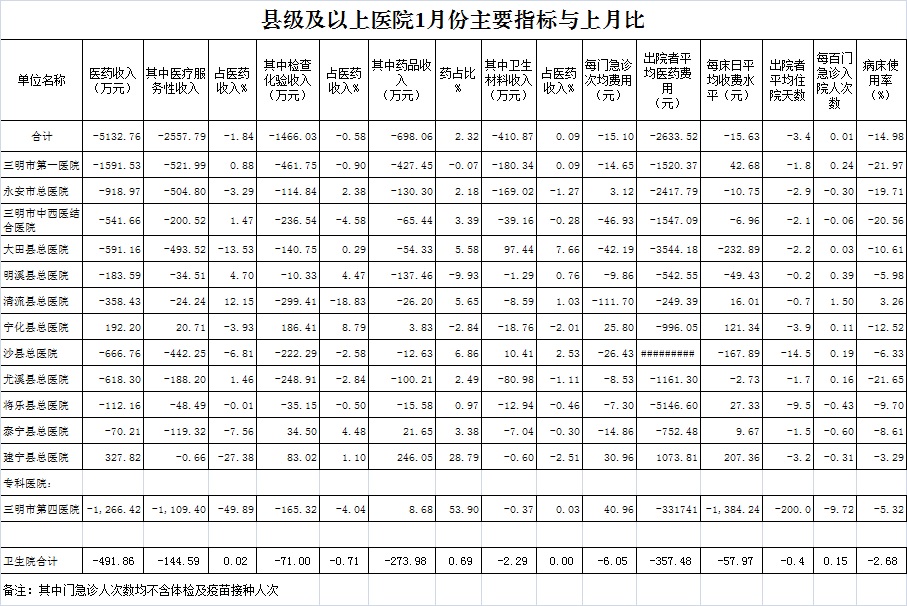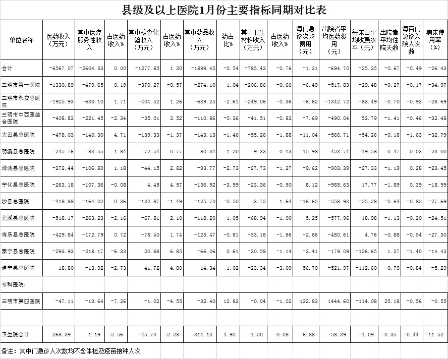 1月份基层医疗机构医药总收入3324.64万元(其中村所收入424.21万元),去年同期3056.26万元,同比增加268.39万元,增长8.78%,其中:医疗服务性收入983.31万元,占医药收入29.58%(床位收入57.29万元、手术治疗护理等服务收入926.03万元),去年同期982.12万元, 医疗服务性收入同比增加1.19万元,增长0.12%;检查化验收入296.24万元,同比下降13.37%;药品收入2029.04万元,去年同期1714.94万元,同比增加314.10万元,增长18.32%,药占比61.03%,去年同期56.11%,同比增长4.92个百分点;卫生材料收入16.05万元,较去年同期17.25万元,同比减少1.20万元,占医药收入0.48%,较去年同期0.56%,同比下降0.08个百分点。入院人次6962人次,去年同期8567人次,同比减少1605人次,下降18.73%,其中永安市、明溪县、泰宁县分别下降46.2%、42.25%、41.02%、;门急诊人次450127人次(其中村所门急诊159054人次),去年同期431767人次,同比增加18360人次,增长4.25%(基层诊疗量占比为46.66%,较去年同期的41.59%增长5.07个百分点);每门诊次均费用62.58元,去年同期55.70元,同比增加6.88元,增长12.35%;出院者平均费用710.28元,去年同期768.67元,同比减少58.39元,下降7.60%。