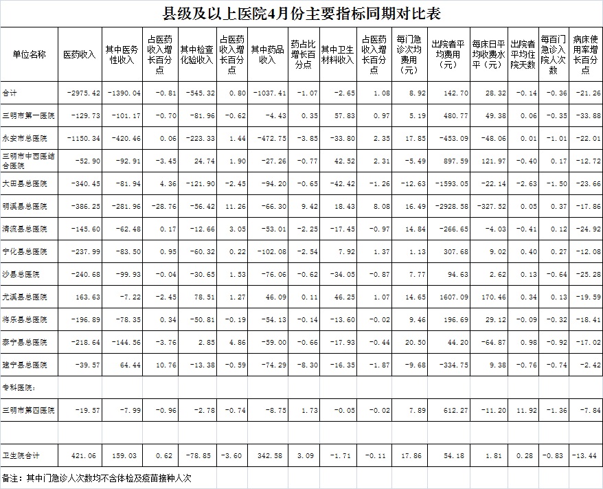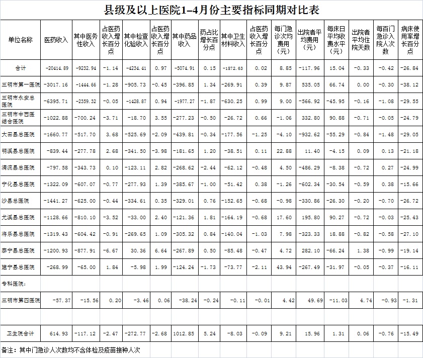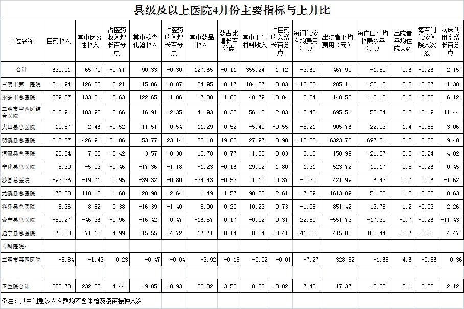 医药总收入。1-4月份12家总医院医药总收入同比下降18.30%(不含体检收入的医药收入同比下降18.20%),增长率超过考核要求(三级医院考核要求为11%,二级医院考核要求为9%)的有12家总医院,其中永安市总医院同比下降29.8%、大田县总医院同比下降27.43%、明溪想县总医院同比下降26.06%。