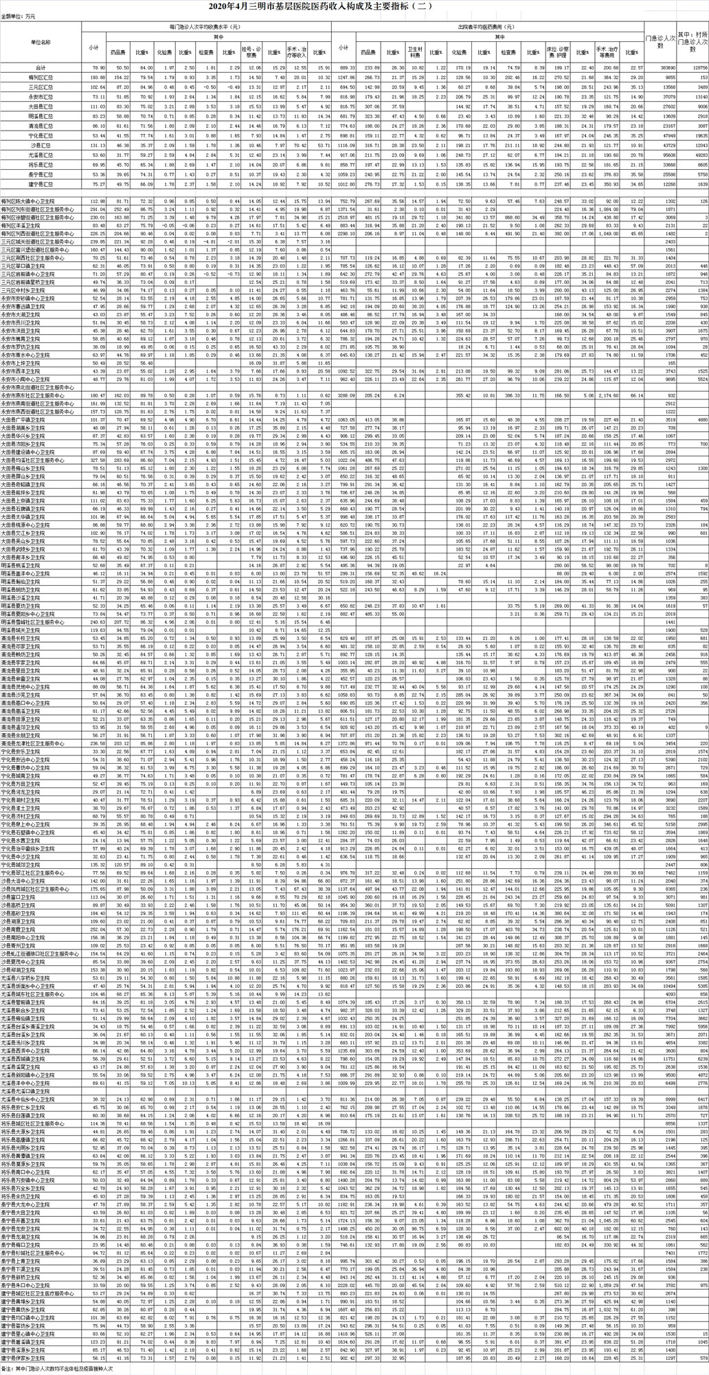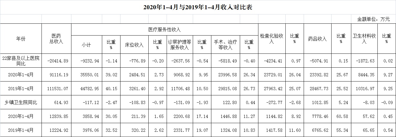 (一)1-4月份12家总医院运行情况:医药总收入91116.19万元,比去年同期111531.07万元减少20414.89万元,下降18.30%(不含体检收入的医药收入为89824.24万元,比去年同期26.04%)。其中:医疗服务性收入35550.01万元,占医药收入39.02%(床位收入2484.51万元、手术治疗护理等服务收入33065.50万元),比去年同期44782.95万元,医疗服务性收入减少9232.94万元,下降20.62%;检查化验收入23729.01万元,占医药收入26.04%,同比下降15.14%;药品收入23392.82万元,药占比25.67%,分别比去年同期下降17.83%、增长0.15个百分点;卫生材料收入8444.35万元(其中高值耗材收入5508.36万元),占医药总收入9.27%,比去年同期9.25%,增长0.02个百分点。入院人次84129人次,比去年同期109978人次,减少25849人次,下降23.50%;门急诊人次1830071人次,比去年同期2192775人次,减少362704人次,下降16.54%;每门诊次均费用197.39元,比去年同期188.55元,增加8.85元,增长4.69%;出院者平均费用6182.27元,比去年同期6300.23元,减少117.96元,下降1.87%。