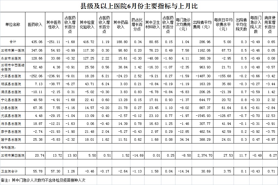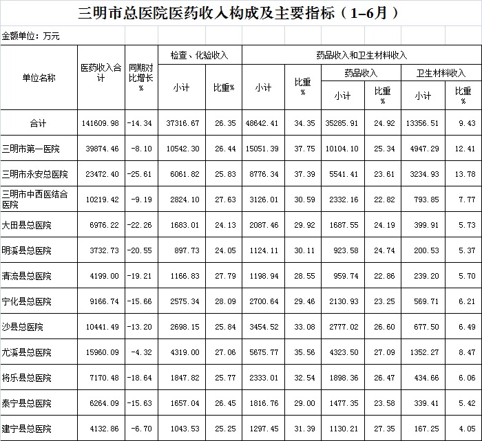 医疗服务性收入占比。1-6月份12家总医院医疗服务性收入占医药总收入39.30%,其中:市第一医院35.81%、三明市永安总医院36.78%、市中西医结合医院41.78%、大田县总医院45.95%、明溪县总医院45.83%、清流县总医院43.66%、宁化县总医院42.44%、沙县总医院41.07%、尤溪县总医院37.38%、将乐县总医院41.69%、泰宁县总医院44.54%、建宁县总医院43.36%,仅大田县、明溪县总医院完成考核指标。