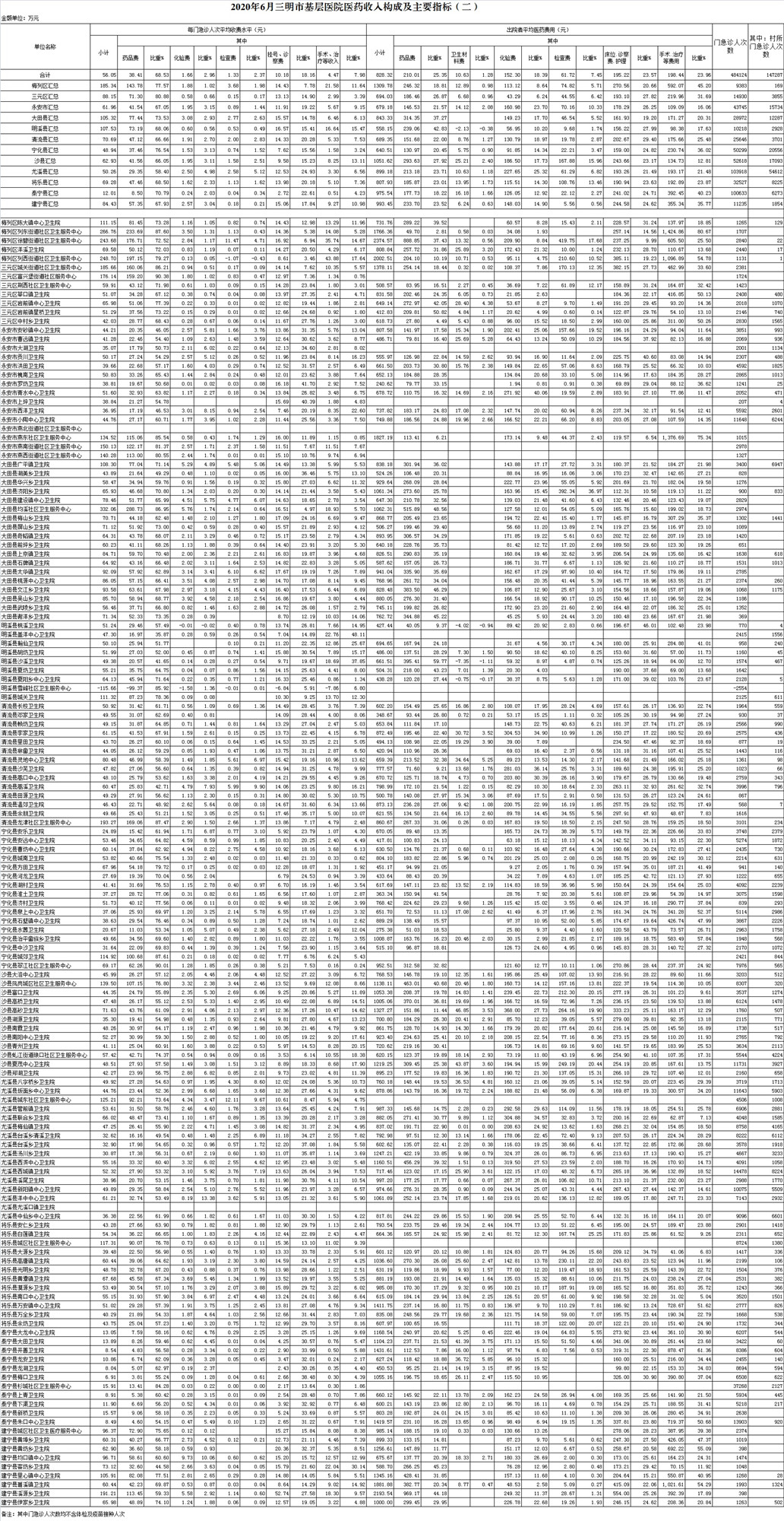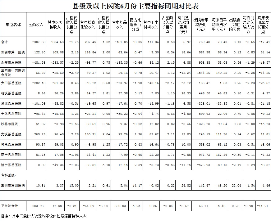 1-6月份基层医疗机构医药总收入19063.56万元(其中村所收入2346.69万元),去年同期18258.78万元,同比增加804.78万元,增长4.41%,其中:医疗服务性收入5452.20万元,占医药收入28.60%(床位收入339.05万元、手术治疗护理等服务收入5113.15万元),去年同期5902.49万元, 医疗服务性收入同比减少450.28万元,下降7.63%;检查化验收入1731.77万元,同比下降18.59%;药品收入11792.06万元,去年同期10133.26万元,同比增加1658.80万元,增长16.37%,药占比61.86%,去年同期55.50%,同比增长6.36个百分点;卫生材料收入87.53万元,较去年同期95.85万元,同比减少8.32万元,占医药收入0.46%,较去年同期0.52%,同比下降0.07个百分点。入院人次38267人次,去年同期54913人次,同比减少16646人次,下降30.31%,其中明溪县、泰宁县、永安市分别下降58.16%、44.70%、39.12%、;门急诊人次2459993人次(其中村所门急诊854318人次),去年同期2355809人次,同比增加104184人次,增长4.42%(基层诊疗量占比为46.38%,较去年同期的41.73%增长4.64个百分点);每门诊次均费用64.87元,去年同期59.34元,同比增加5.52元,增长9.31%;出院者平均费用821.02元,去年同期790.79元,同比增加30.23元,增长3.82%。