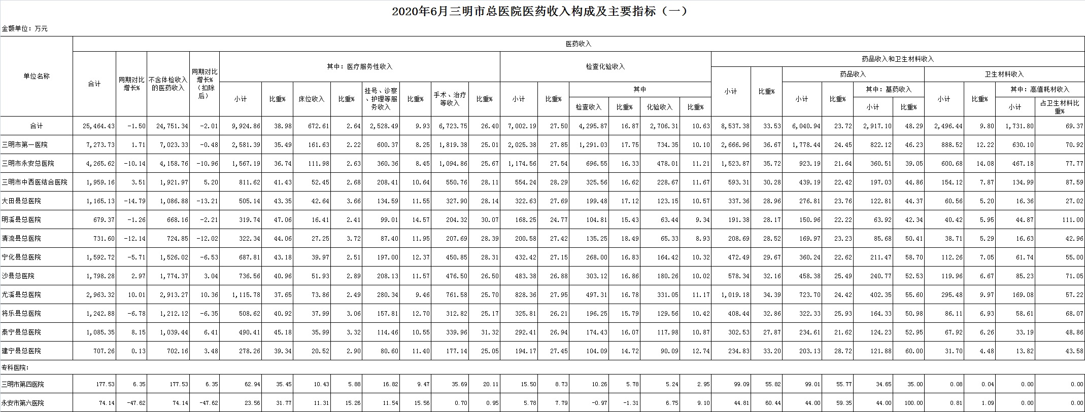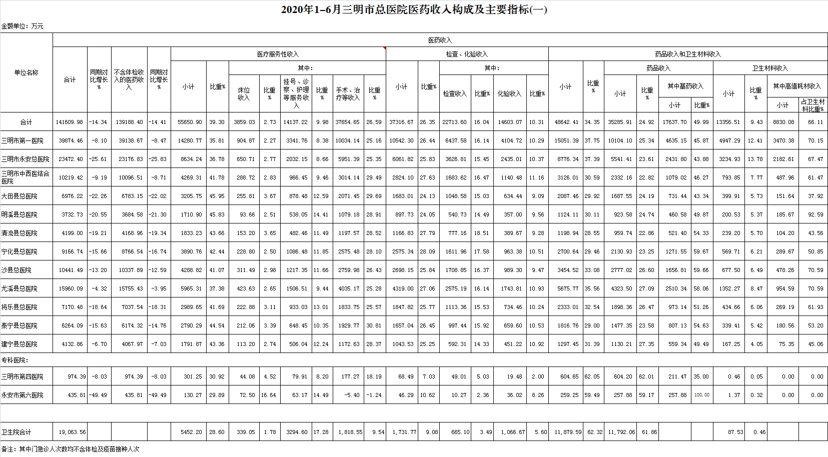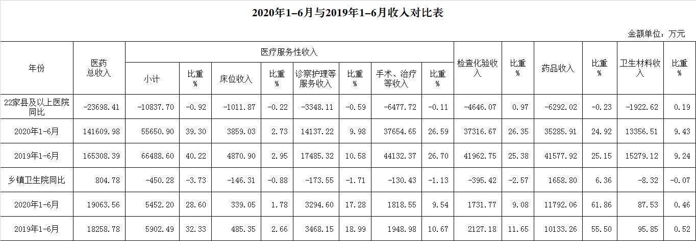 (一)1-6月份12家总医院运行情况:医药总收入141609.98万元,比去年同期165308.39万元减少23698.41万元,下降14.34%(不含体检收入的医药收入为139188.40万元,同比下降14.41%)。其中:医疗服务性收入55650.90万元,占医药收入39.30%(床位收入3859.03万元、手术治疗护理等服务收入51791.87万元),比去年同期66488.60万元,医疗服务性收入减少10837.70万元,下降16.30%;检查化验收入37316.67万元,占医药收入26.35%,同比下降11.07%;药品收入35285.91万元,药占比24.92%,分别比去年同期下降15.13%、下降0.23个百分点;卫生材料收入13356.51万元(其中高值耗材收入8830.08万元),占医药总收入9.43%,比去年同期9.24%,增长0.19个百分点。入院人次129789人次,比去年同期164072人次,减少34283人次,下降20.90%;门急诊人次2844450人次,比去年同期3289108人次,减少444658人次,下降13.52%;每门诊次均费用195.75元,比去年同期188.12元,增加7.62元,增长4.05%;出院者平均费用6294.90元,比去年同期6172.44元,增加122.46元,增长1.98%。