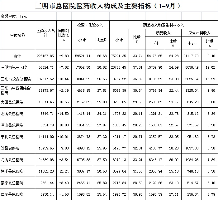 医疗服务性收入占比。1-9月份12家总医院医疗服务性收入占医药总收入39.58%,其中:市第一医院35.87%、三明市永安总医院37.13%、市中西医结合医院42.15%、大田县总医院45.27%、明溪县总医院46.62%、清流县总医院43.77%、宁化县总医院42.83%、沙县总医院41.24%、尤溪县总医院38.60%、将乐县总医院41.71%、泰宁县总医院45.60%、建宁县总医院43.47%,仅大田县、明溪县总医院完成考核指标。