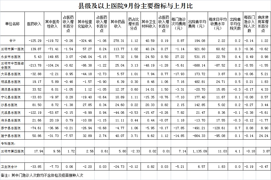 药品与卫生材料占比。9月份12家总医院药品与卫生材料收入占医药总收入的33.40% ,比去年同期33.94%,下降0.54个百分点。达标医院4家,超过核定指标有8家医院,其中市第一医院超过5.40个百分点、永安市总医院超过4.35个百分点、沙县总医院超过2.94个百分点。